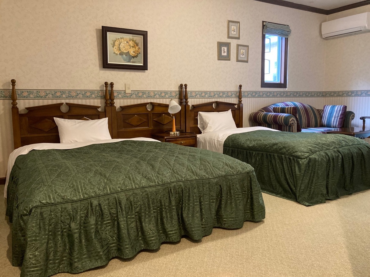 ダブルベッド1台とシングルベッド1台の使い勝手のよい広いお部屋のツインベッドルーム(25㎡)です。 独立タイプの専用内風呂(英国輸入洋風呂)・温水洗浄トイレが付いています。(プラズマクラスター加湿&空気清浄器設置しました。) 夕食は地場産野菜等を使ったフレンチフルコース。朝食は、さわやかにイングリッシュブレックファーストを、お楽しみ下さい。 ※アレルギー食の対応は行っておりません、ご了承ください。 アメニティグッズ(フェイスタオル・バスタオル・POLA社シャンプー・コンディショナー・ボディソープ・歯ブラシ・ボディタオル・ヘアブラシ・綿棒、女性用ヘアゴム&コットンセット、男性用髭剃り)と作務衣もご用意し、手ぶら感覚で宿泊できます。 アルカリ性単純温泉の貸切岩風呂と貸切露天風呂が無料でそれぞれ40分間の予約制で入浴可能です。チェックイン順にご予約出来ます。 ※夕食は、18時30分からになります。(18時頃までにチェックインをお願いいたします。) ◎医療機関などで使用される世界最強レベル空気清浄機「エアドッグ」2台をレストランとロビー設置いたしました。 ※歯ブラシ・ヘアブラシをバイオマス素材に、ボディスポンジをボディタオルに変更しました。