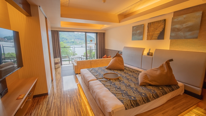 全てのお部屋から富士山と河口湖が一望できます。ラージ座洋室55平米(ツイン+和室スペース)・TV完備ジャグジーバス付・トイレ付・テラス10平米