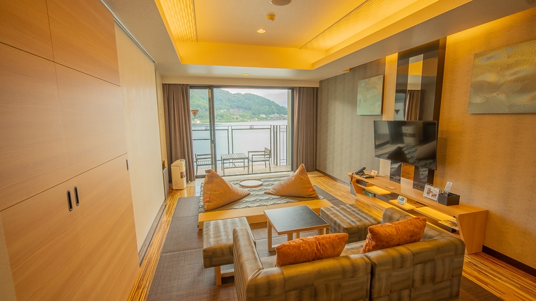 全てのお部屋から富士山と河口湖が一望できるグランドビュー。座室35平米(和室10畳)・シャワーブース付・トイレ付・テラス10平米付 客室内・テラスとも禁煙