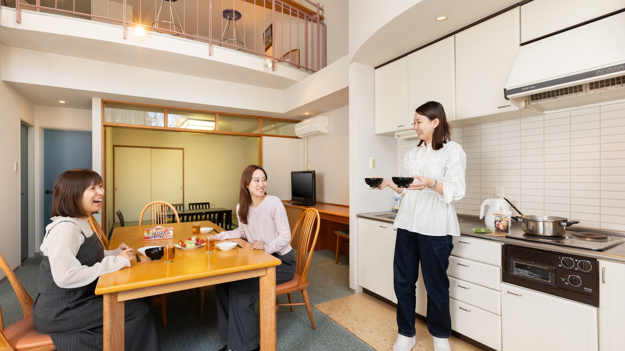 客室55平米・最大定員5名まで・ユニットバス・トイレ(洗浄機能付)・キッチン・ 液晶テレビ・冷蔵庫・ポット・炊飯器・オーブンレンジ・調理器具・食器