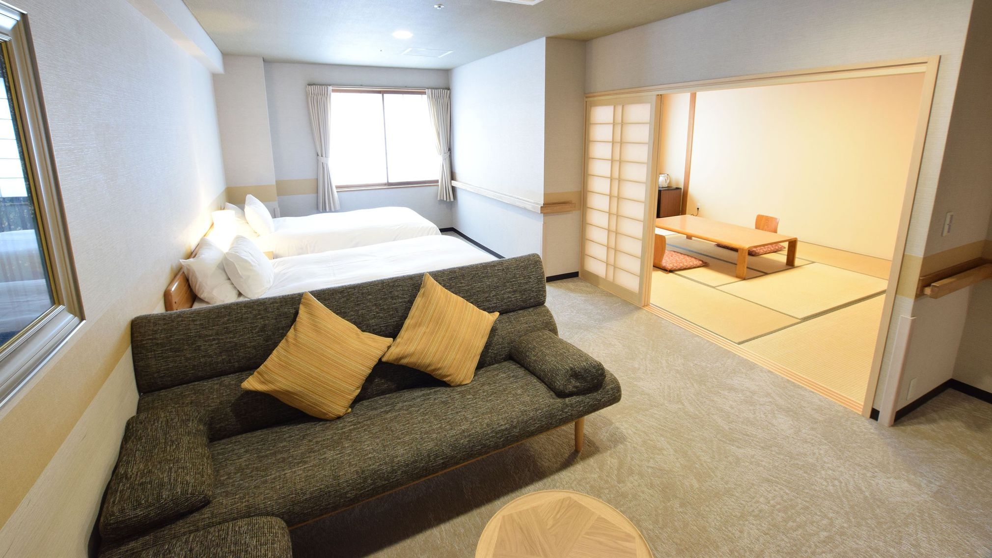和モダンなインテリアの12畳の和室とベッドルームを備えた上質な客室。