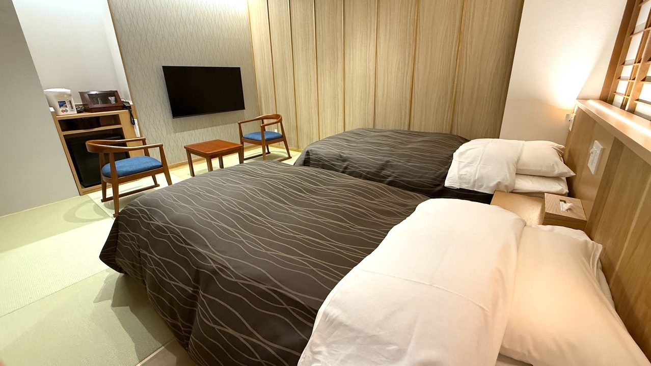 2024年にフルリノベーションした、ツインベッドを配置した和モダンのお部屋です。景色は望めません。お布団を2組敷いて最大4名様までご利用が可能です。