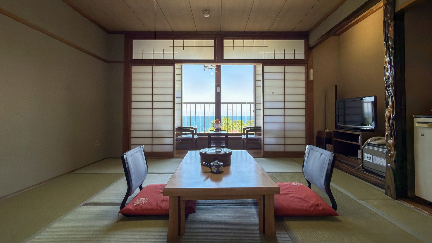 1〜5名様でご利用いただけるトイレ付きの和室。山側または海側、10畳〜12畳のお部屋がございます。 ※お部屋はお選びいただけませんので、予めご了承ください。