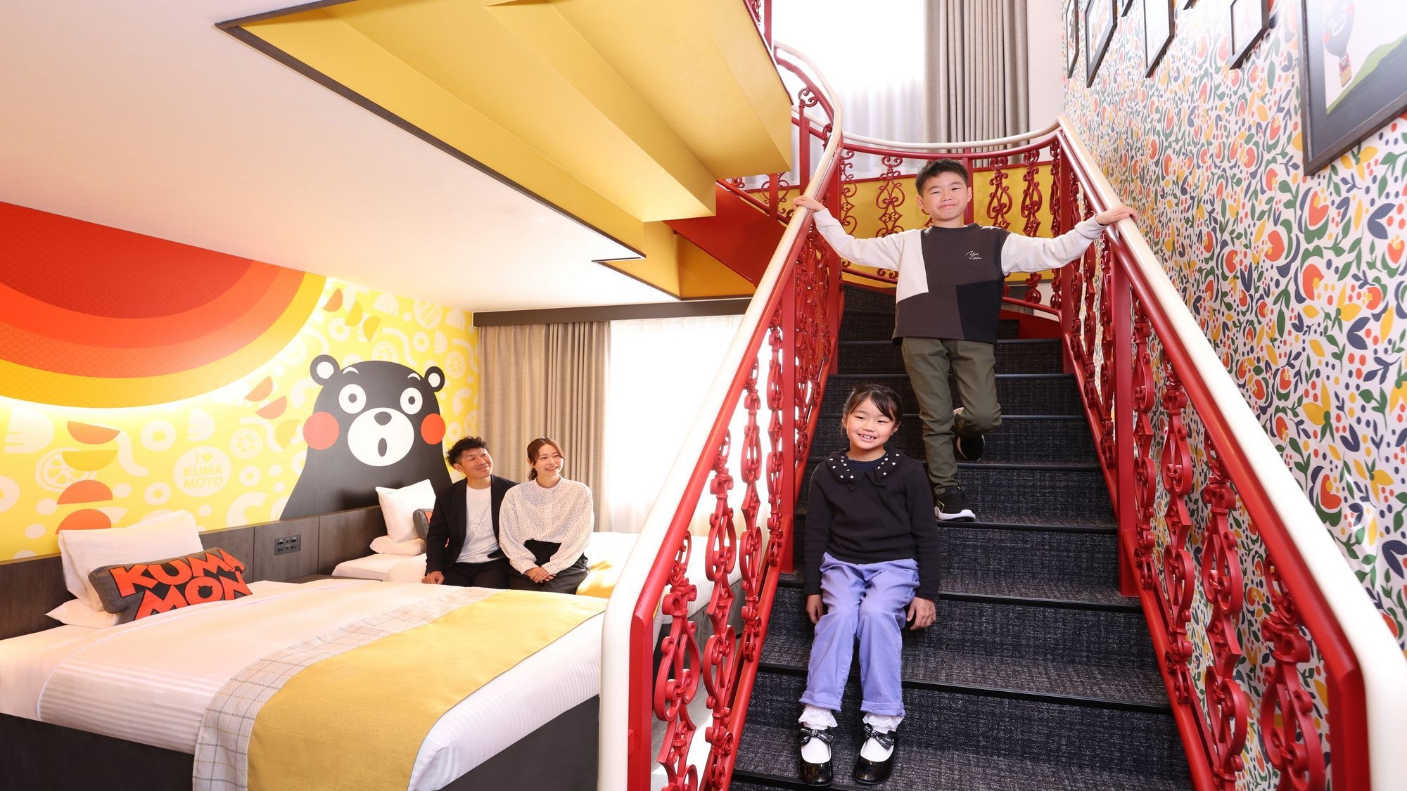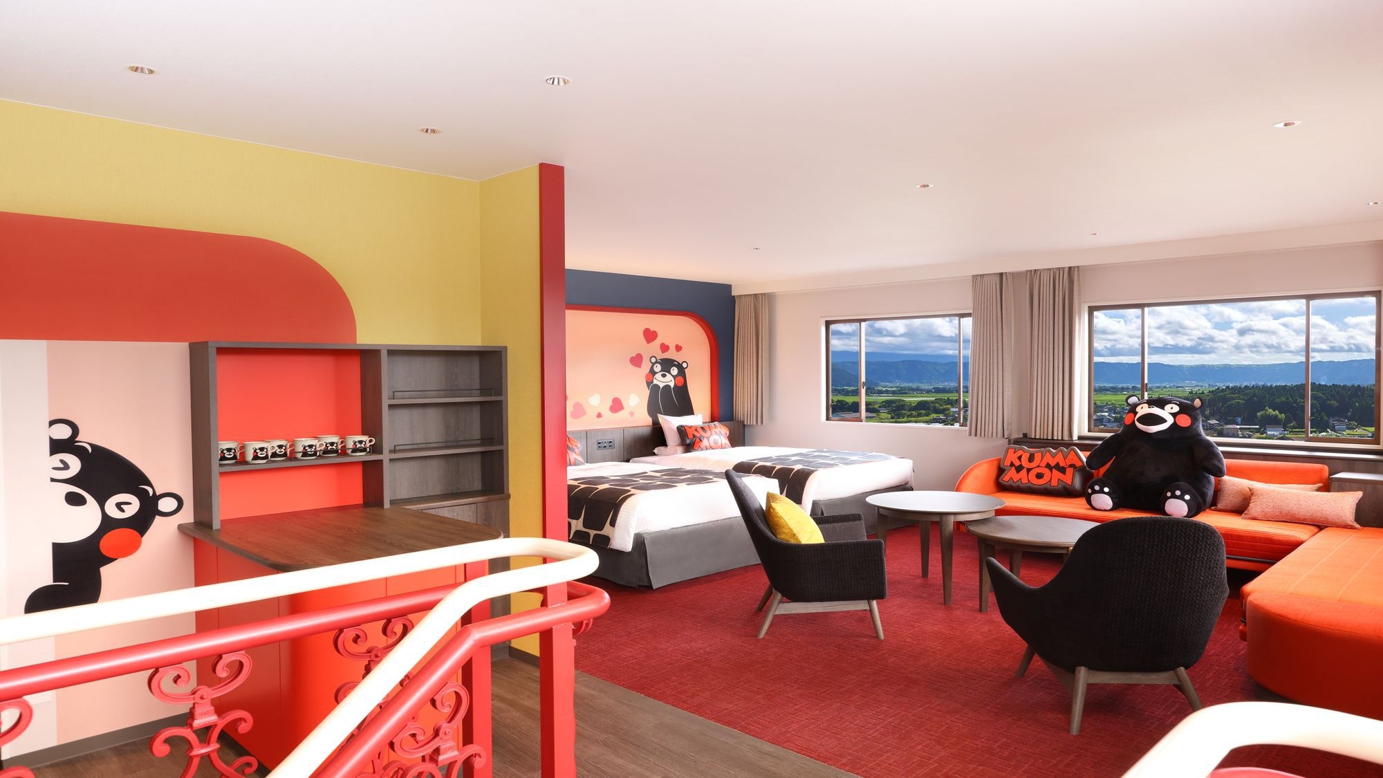 【2025年2月誕生】部屋のあちこちにくまモンがあしらわれた、特別室。リビングと螺旋階段でつながる2階にあるベッドルームが嬉しいメゾネットルーム。