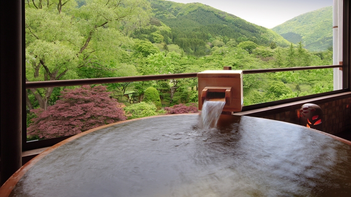 客室の温泉風呂から眺める「最上の美しい四季」が織りなす景色は、