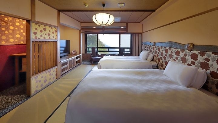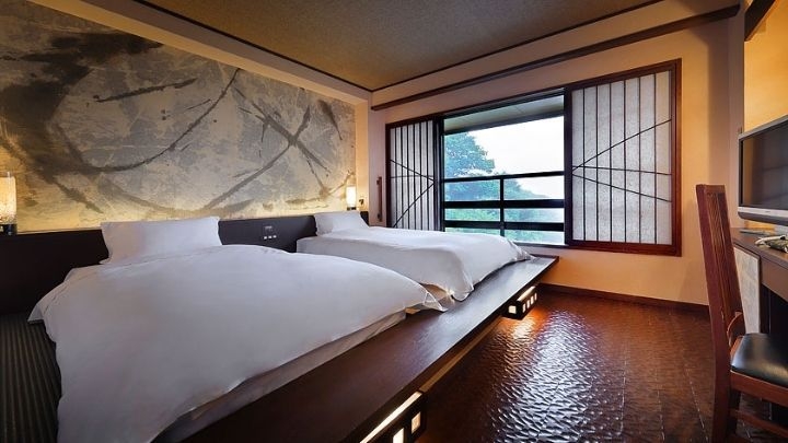 【禁煙】和の落ち着きと洋の利便性を兼ね備えた、10畳の和室にツインベッドを配置。露天風呂や貸切風呂は、天然温泉のかけ流し。記念日のご利用にも最適です。