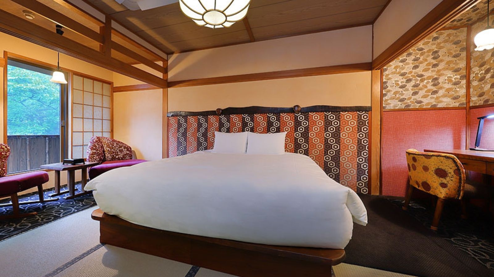 17平米の和室にクイーンサイズのダブルベッドを1台設置。大浴場の露天風呂や貸切風呂は、すべて天然温泉のかけ流し。記念日など大切なひとときを、お過ごしください。