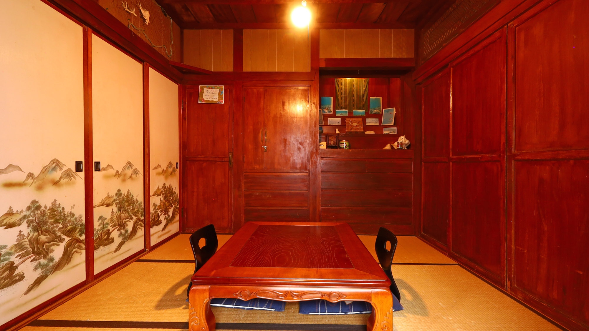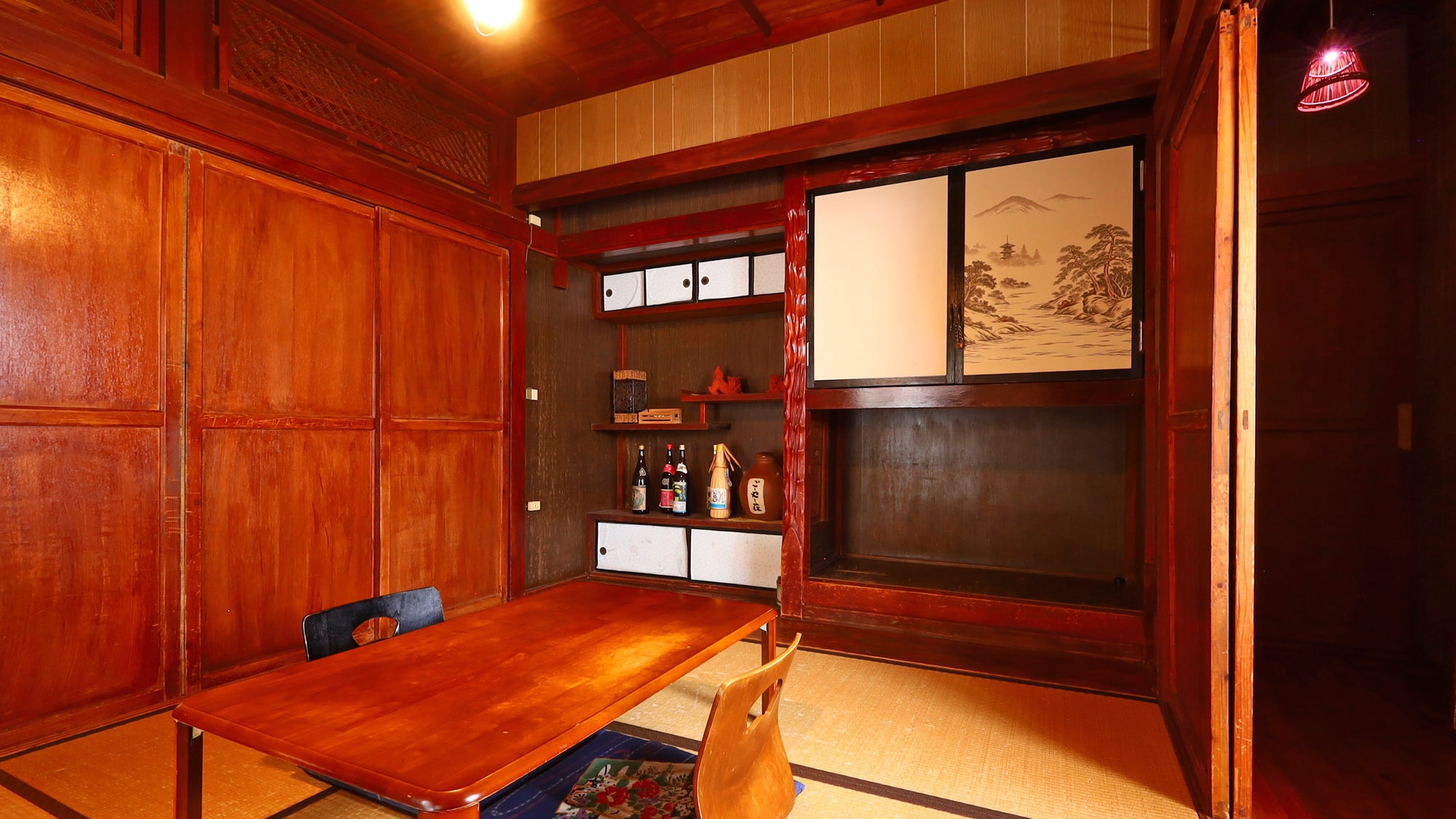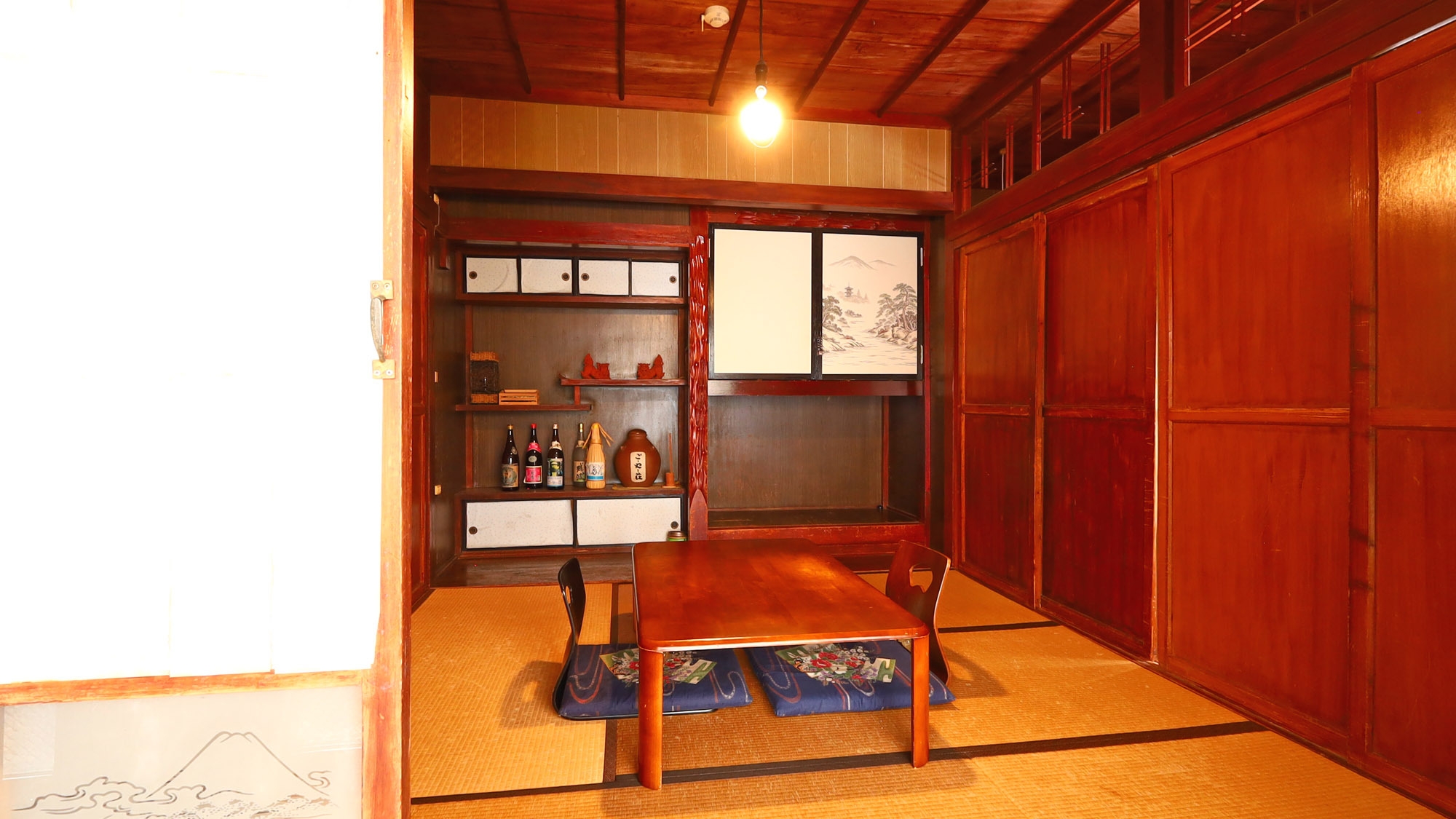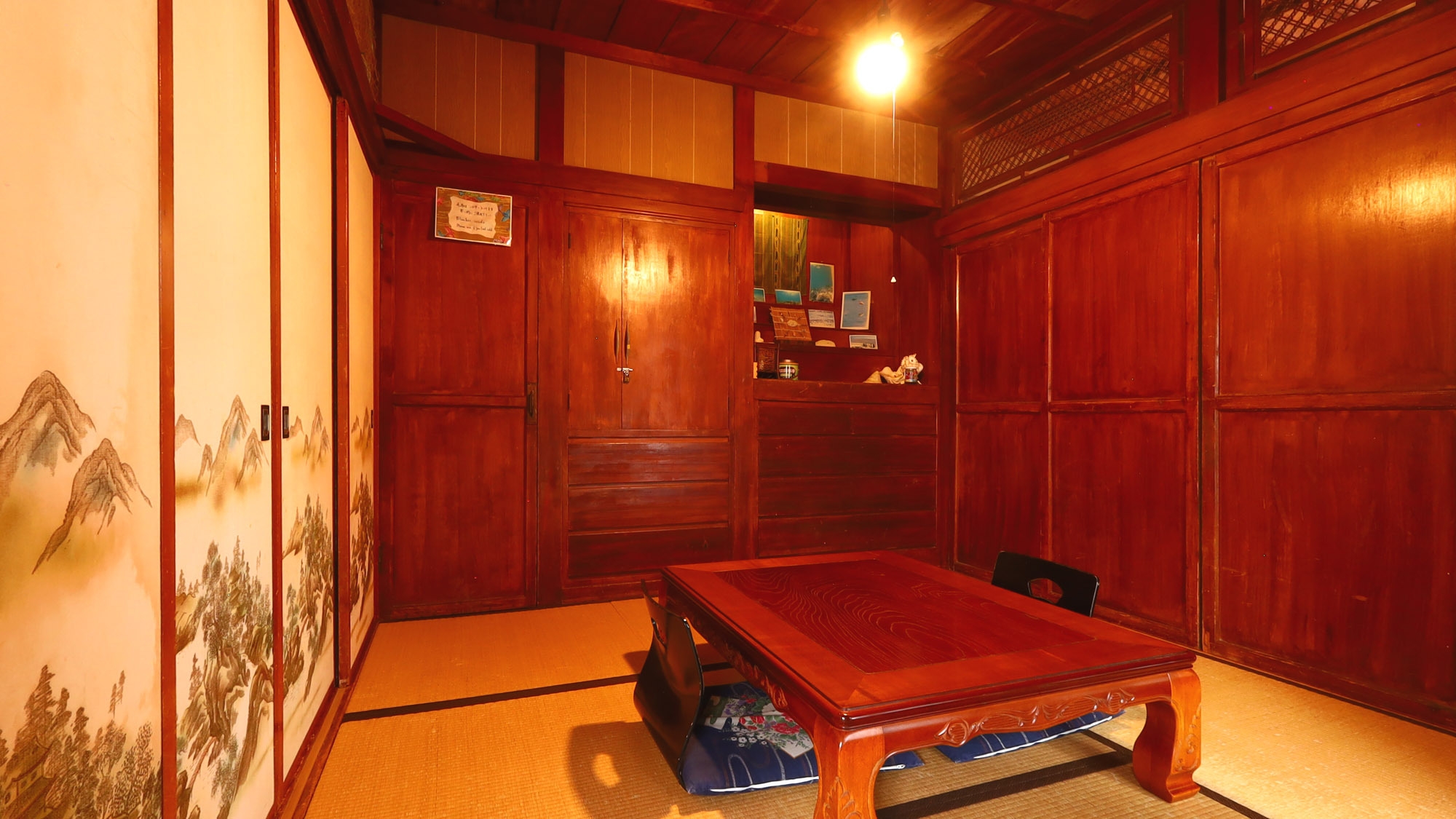 沖縄の伝統的な瓦屋根古民家の三番座と呼ばれる和室一室を利用したお部屋です。部屋の広さは4.5畳でこじんまりした中にも木造りや畳の懐かしい雰囲気のあるお部屋です。