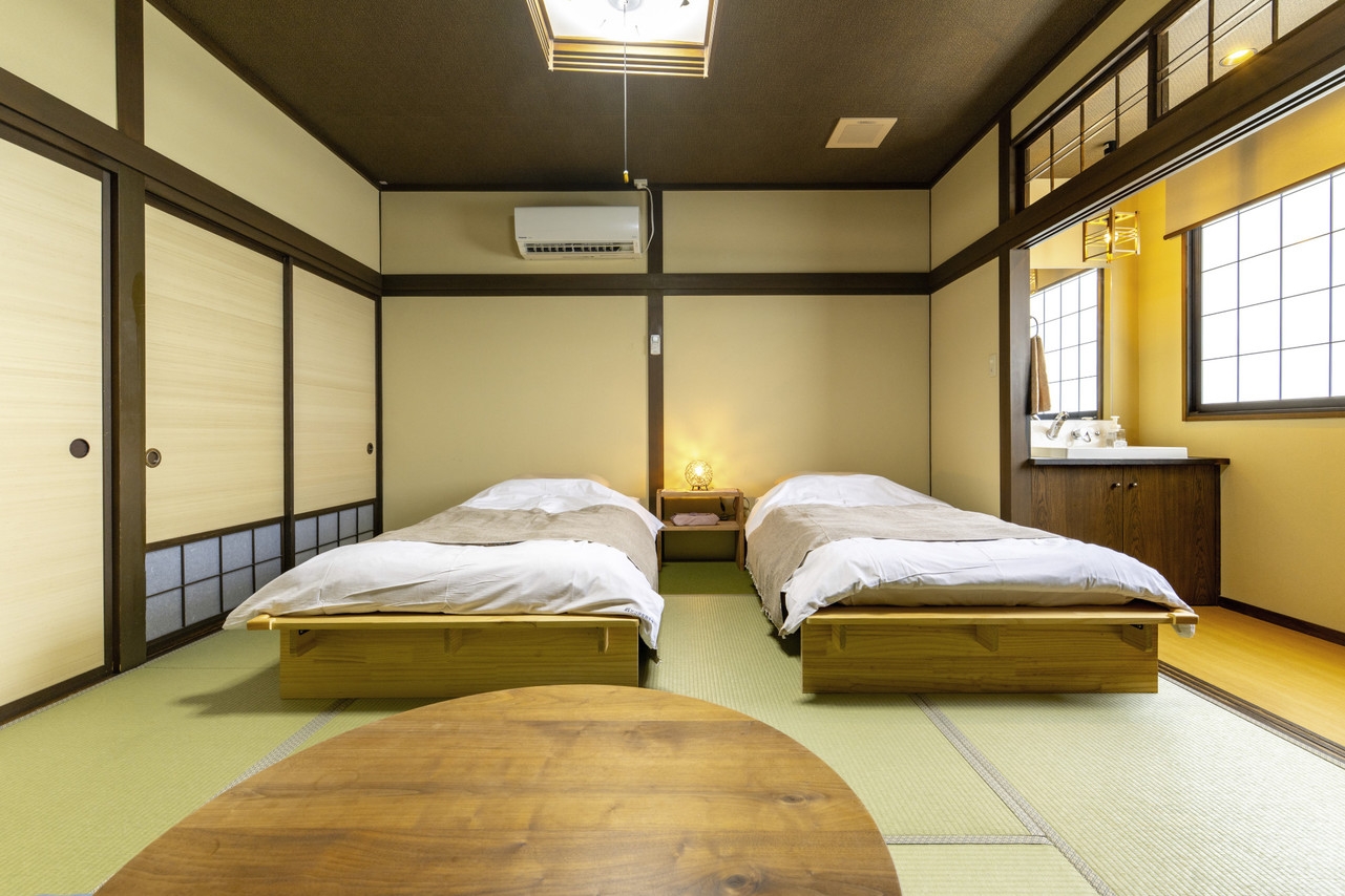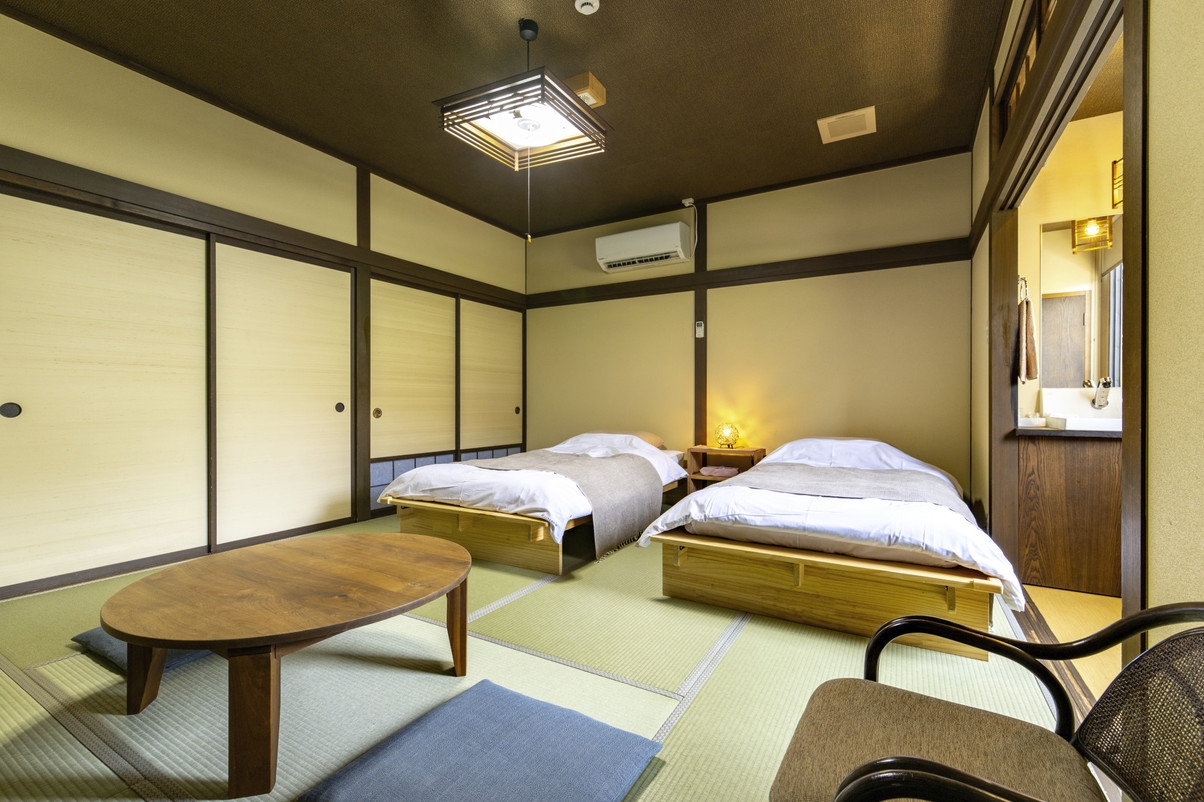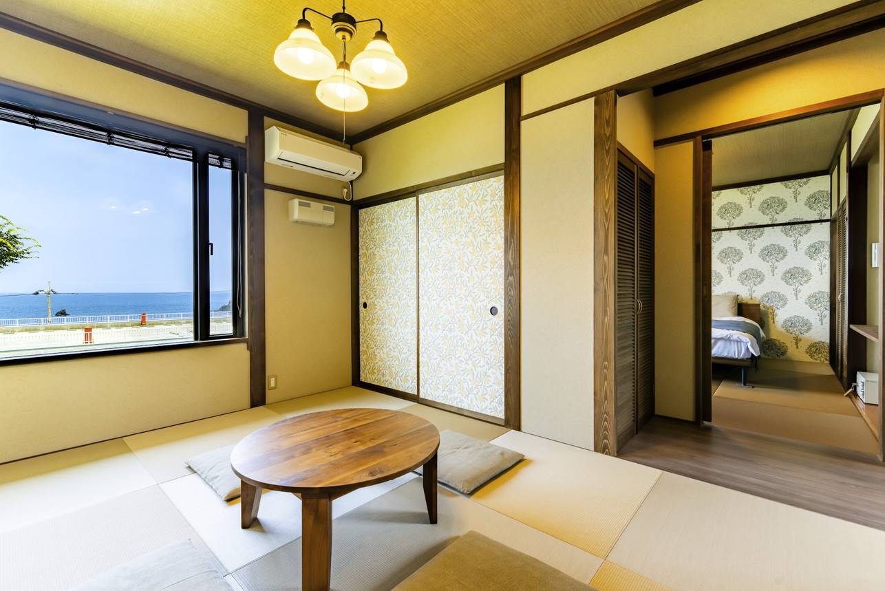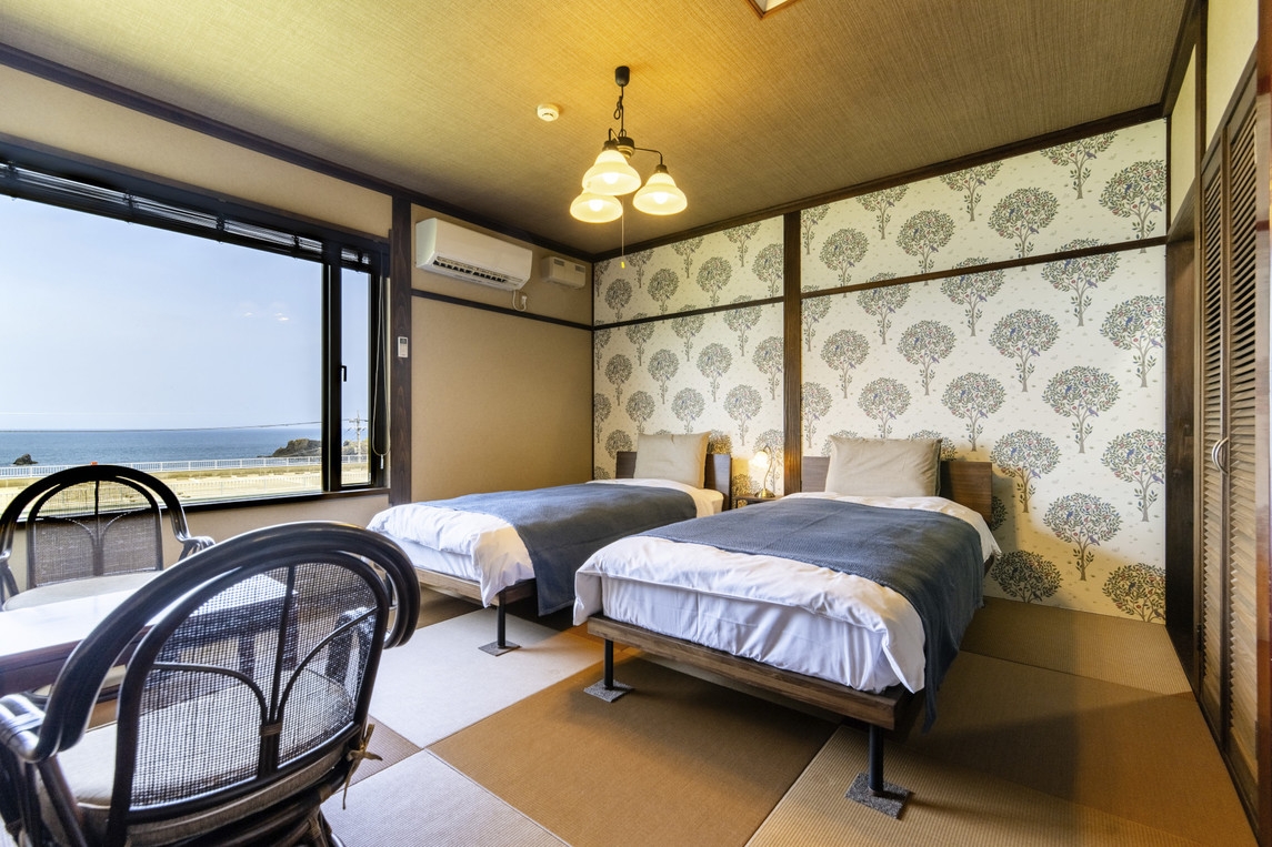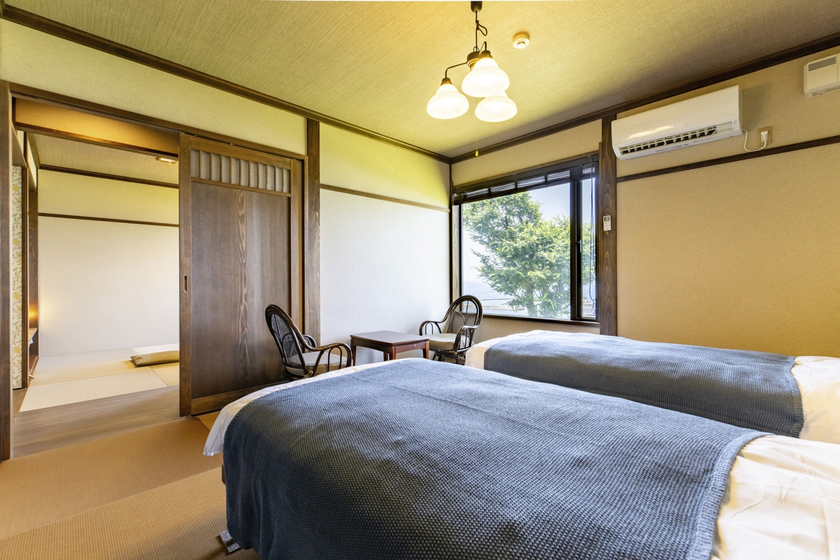 令和7年7月にリニューアルオープン・ベッド2台付きの客室 ◆8畳+6畳の二間続きで日本海一望で島々を望む絶景の客室 。夕映専用のトイレと洗面台は近くに確保。