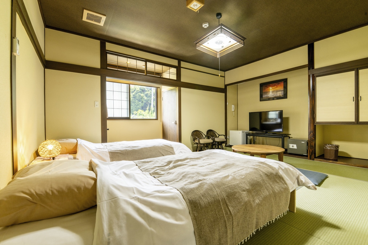 <オーシャンビューの和洋室><眺望良好の客室>トイレ付・洗面台付<ベッド2台付と簡易ベッド1台付で3台可能>和室+洋室は2部屋で仕切られ。心がとても癒されます。