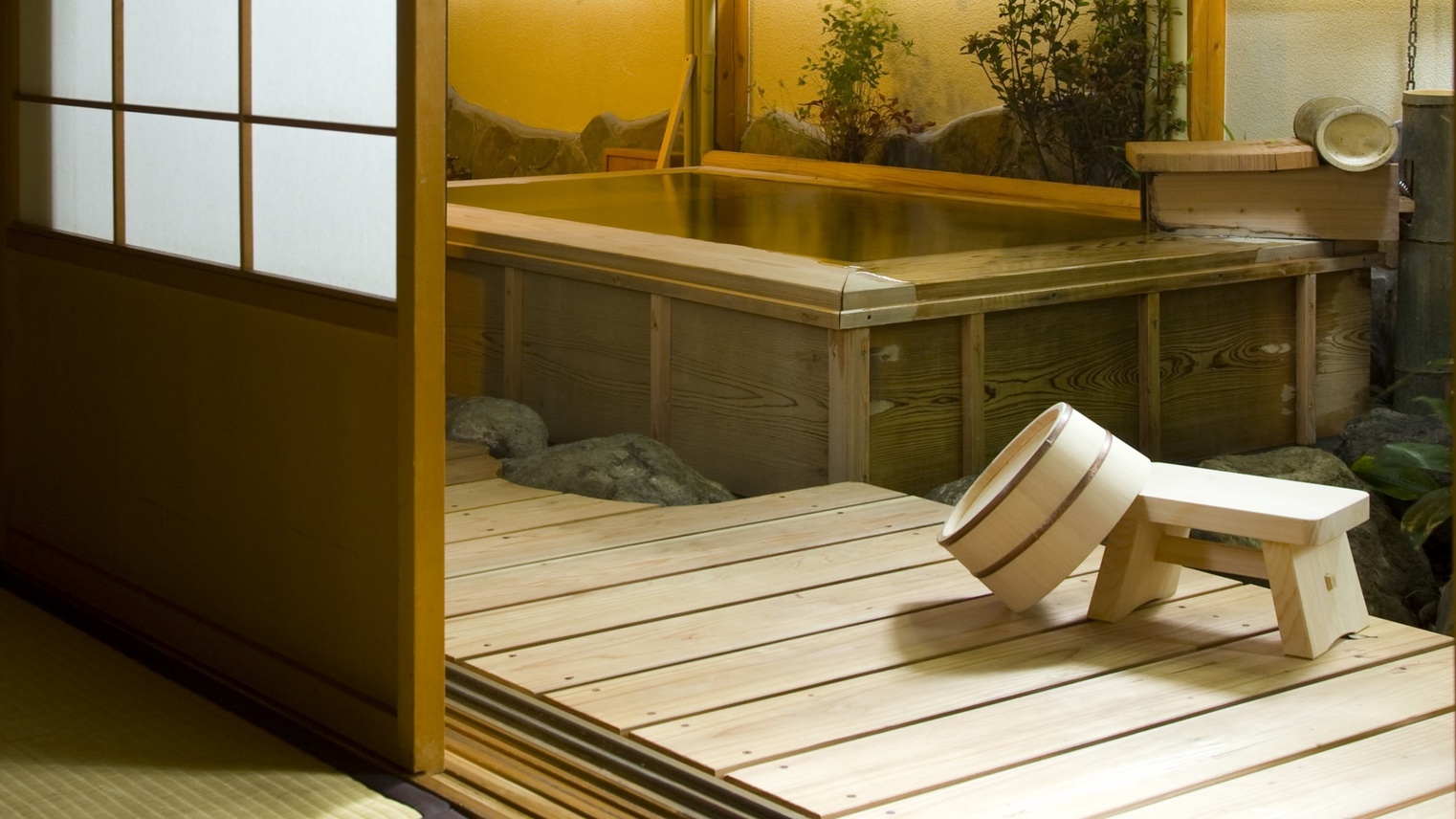 露天風呂付き純和風の2間続きの和室のお部屋です。 静かで落ち着いていて、ゆっくりとした時間をお過ごしいただけます。 【設備】露天風呂/内風呂/洋式トイレ(ウォシ