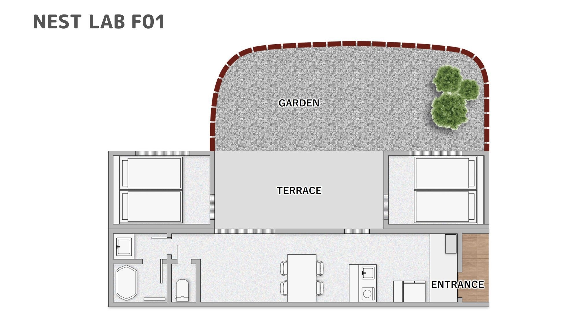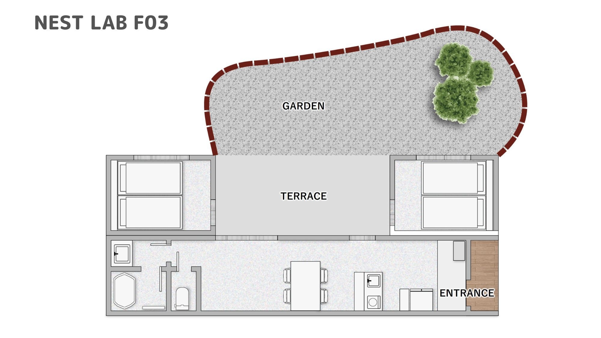 LDK以外に2室の寝室と1室の個室を備え、プライベートを配慮した空間に。■LDK・ロフト寝室・寝室×2・バス・トイレ・洗面所・テラスデッキ ★ペット宿泊可