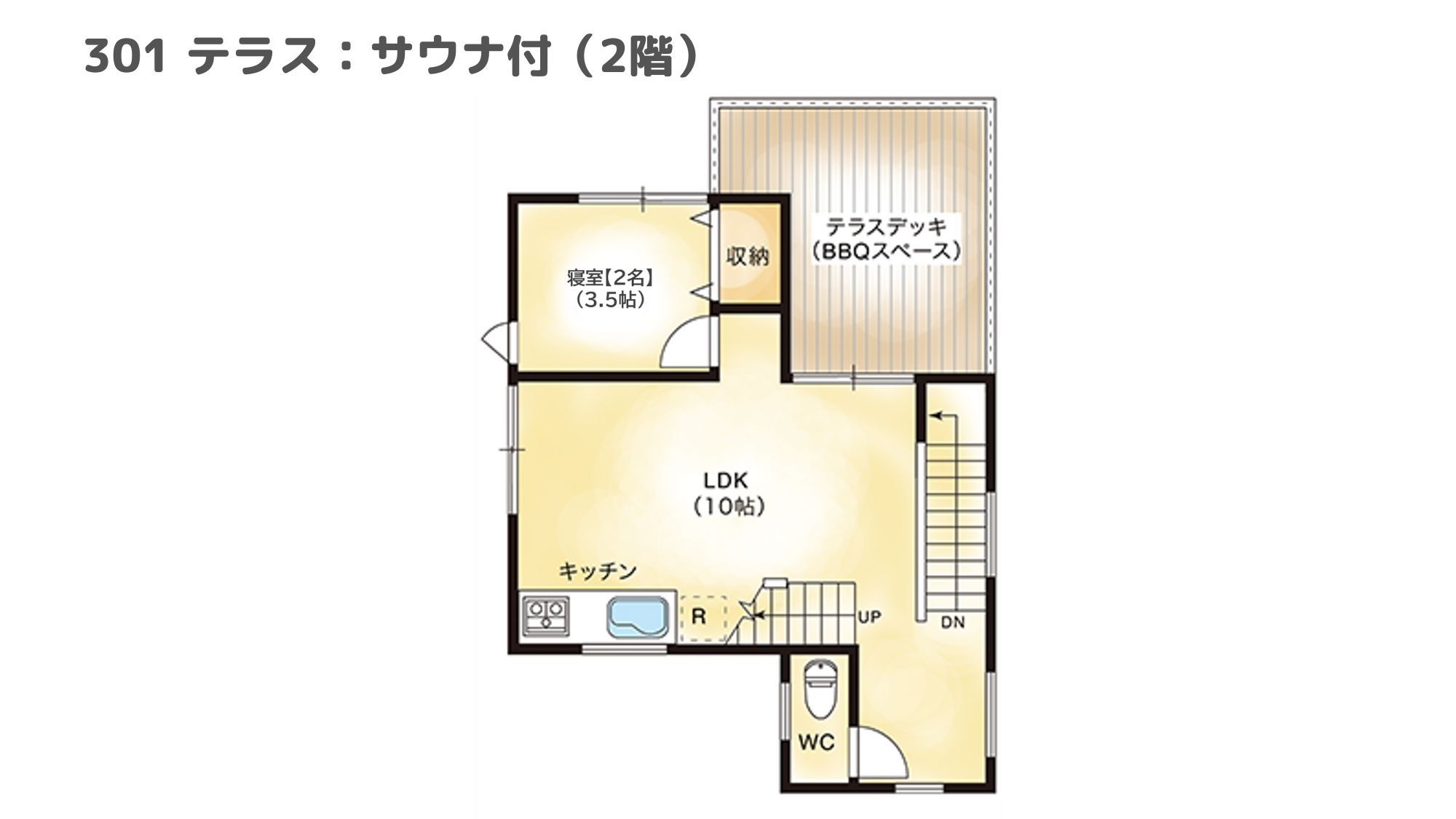 滞在中自由に利用OKの【プライベートサウナ】付!2つの寝室で三世帯やグループにおすすめ■LDK・ロフト寝室・寝室・バス・トイレ・洗面所・テラスデッキ■ペット不可