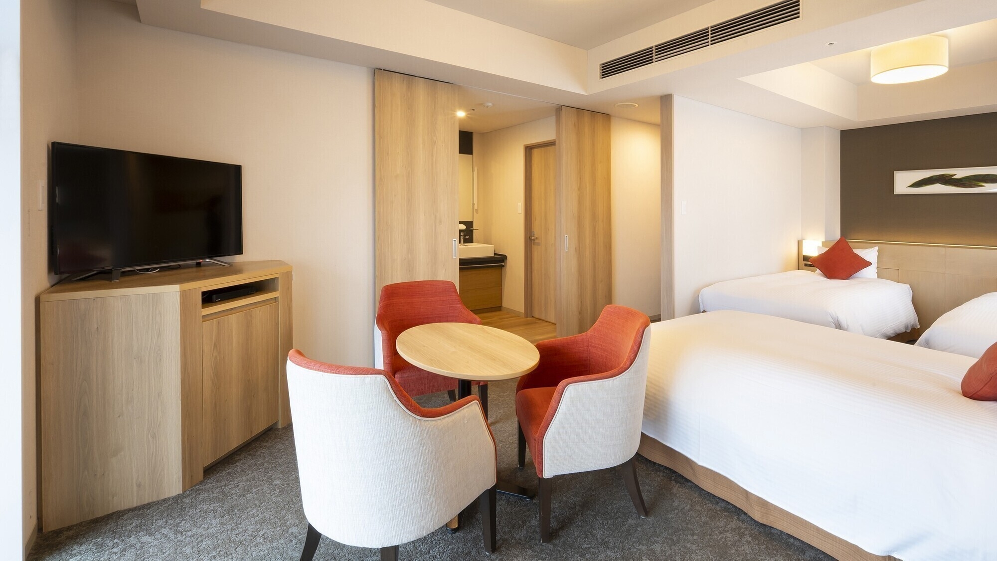 洗い場付きの独立型バスルーム(洗面台・トイレ別)44平米禁煙 3名様でご利用の際はスタッキングベッドを 1台ご用意いたします。