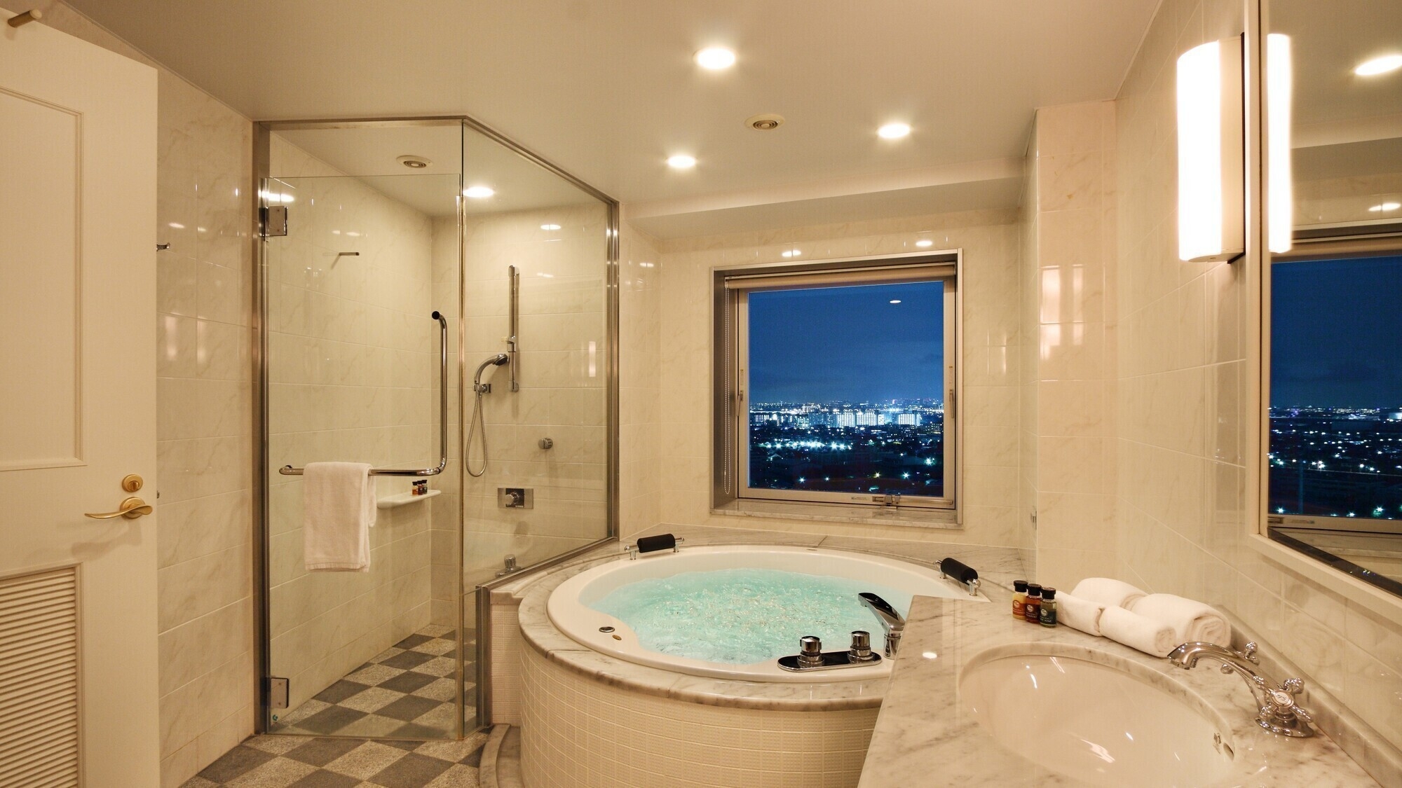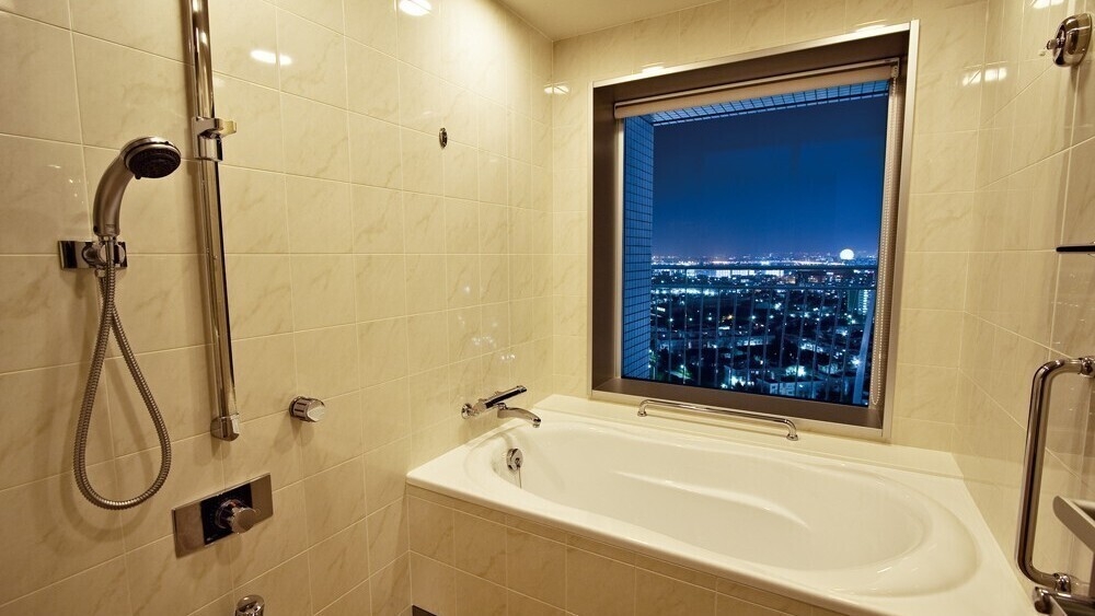 全室洗い場付きバスルームでお部屋の広さはゆとりの60平米。13階以上に位置し、夜景を見ながらのバスタイムが楽しめるビューバス付き。