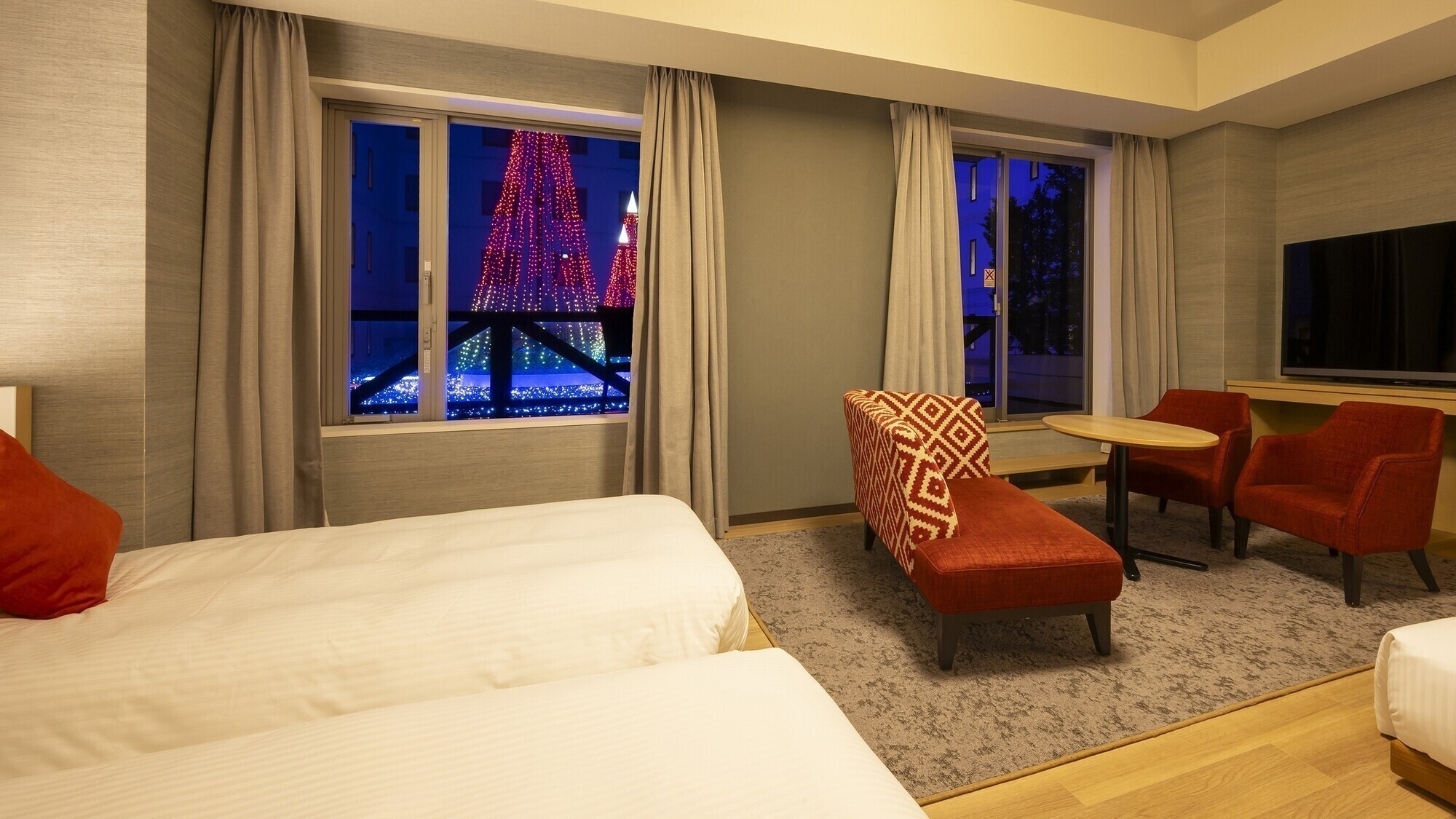 イルミネーションツリーが光り輝く中庭に面した6室限定のヒカリテラスルーム。季節毎の光の演出が楽しめるウッドテラスを設置。