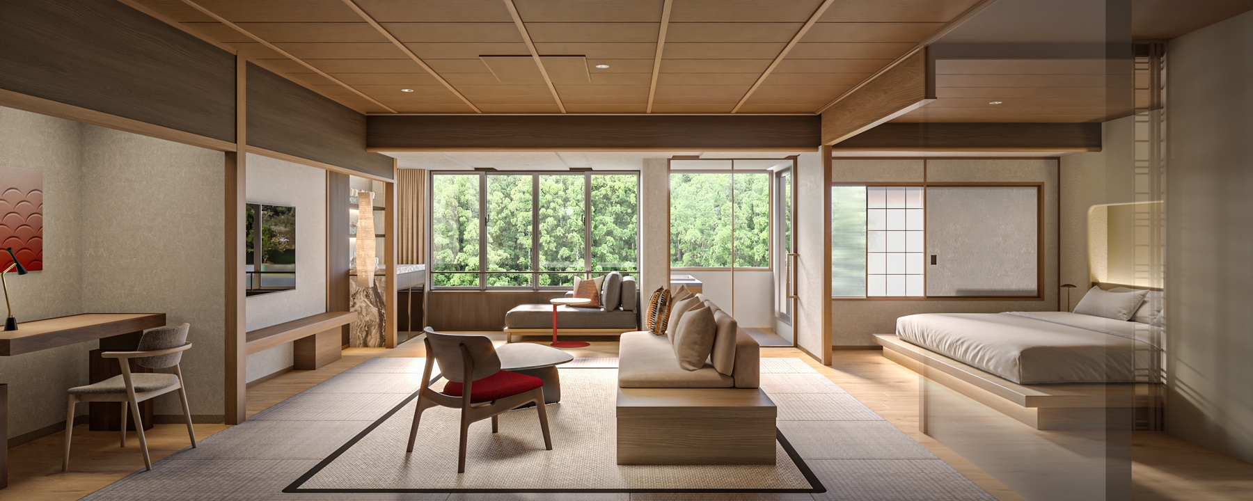 室内に露天風呂を設け、窓際にはデイベッドとミニバーを配置。 豊かな緑を眺めながら、自然と一体化したような安らぎのひとときをお過ごしいただけます 約80平米
