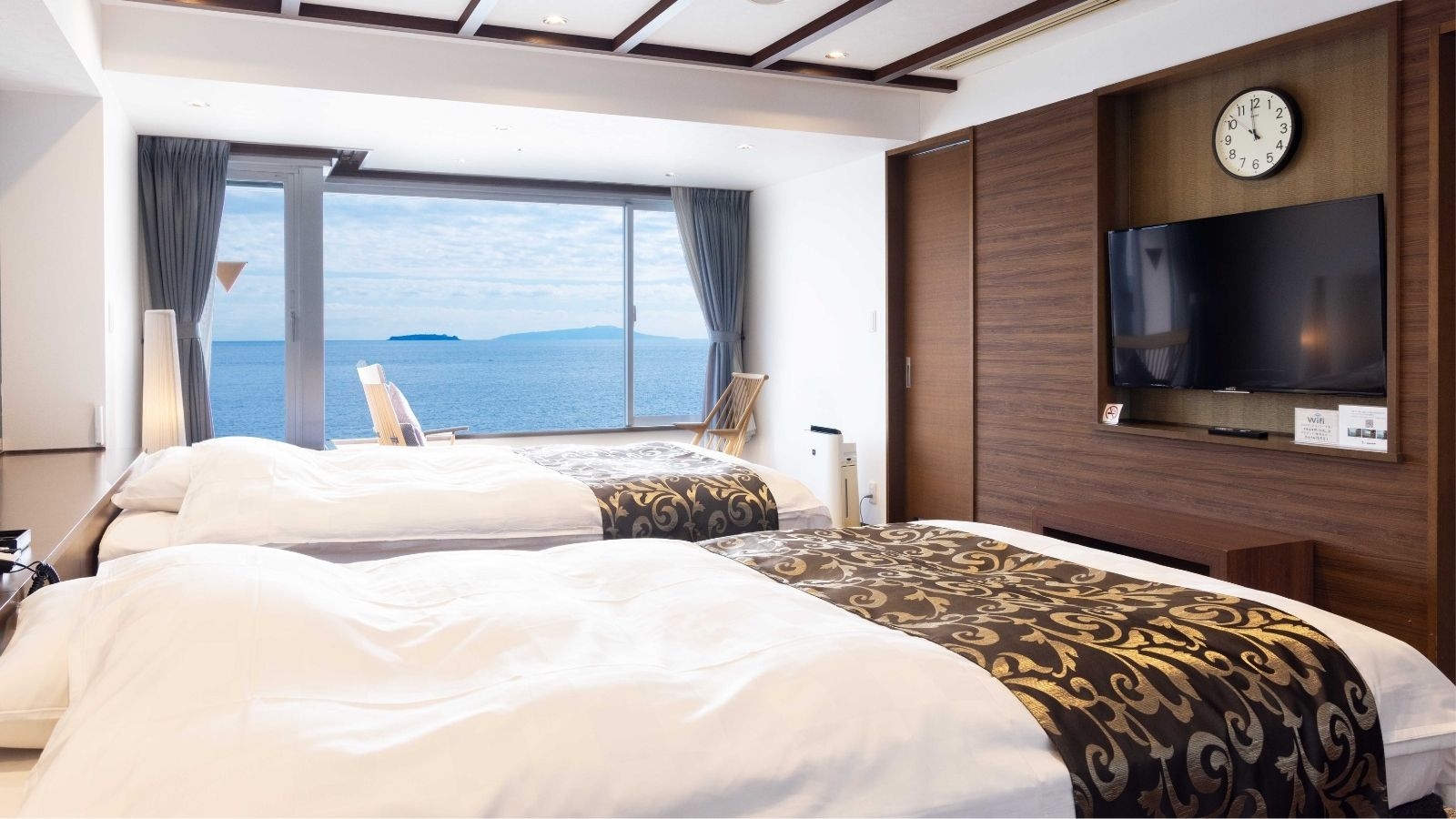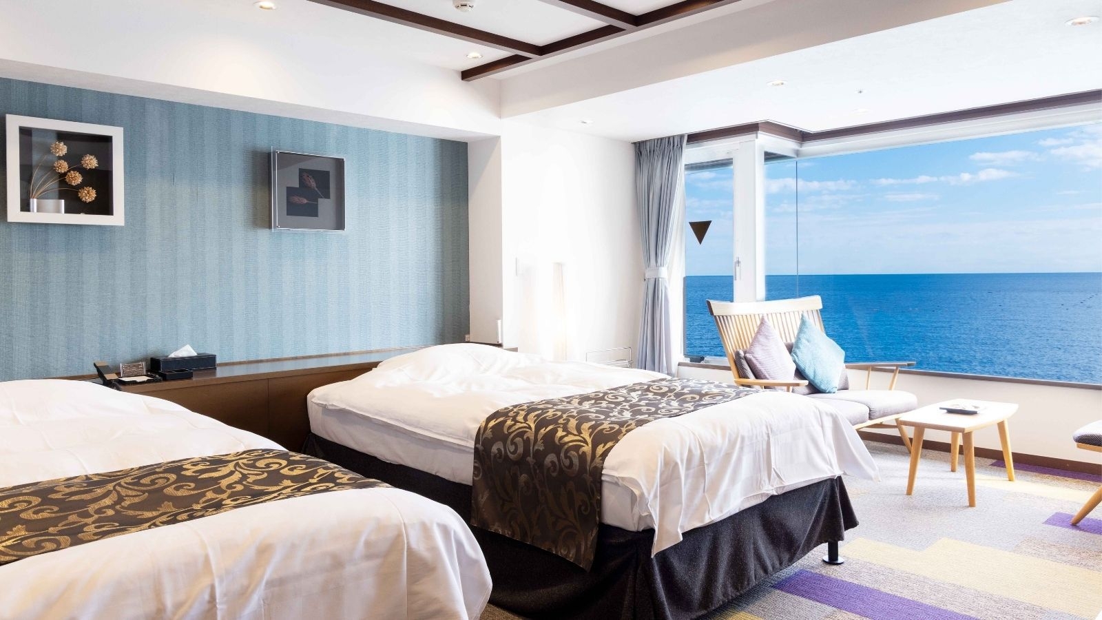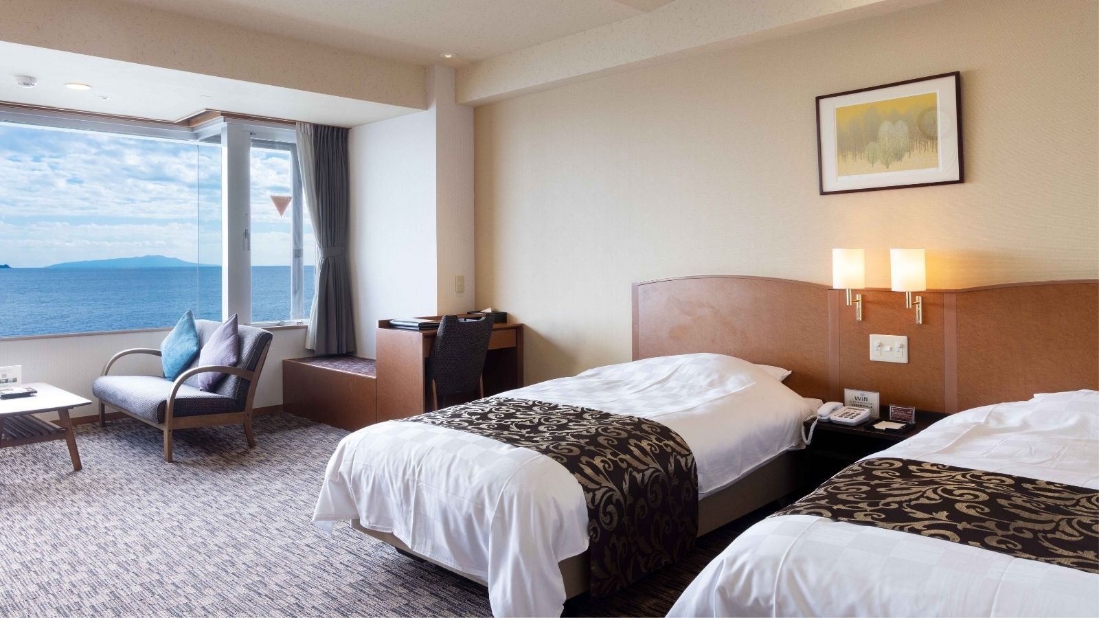 大きなベットで快適にお過ごしいただける、広さ33平米のゆったりとしたツインルーム。 お部屋の窓からは目の前に広がる海を一望できます。