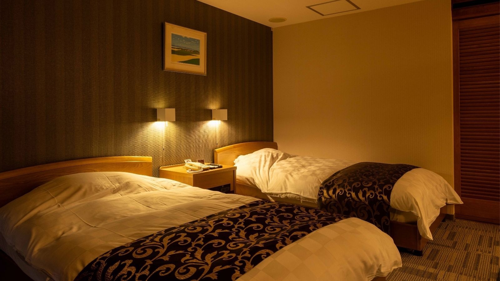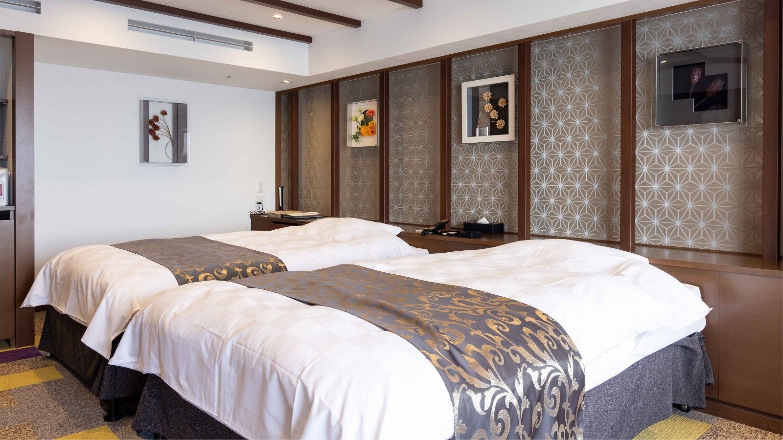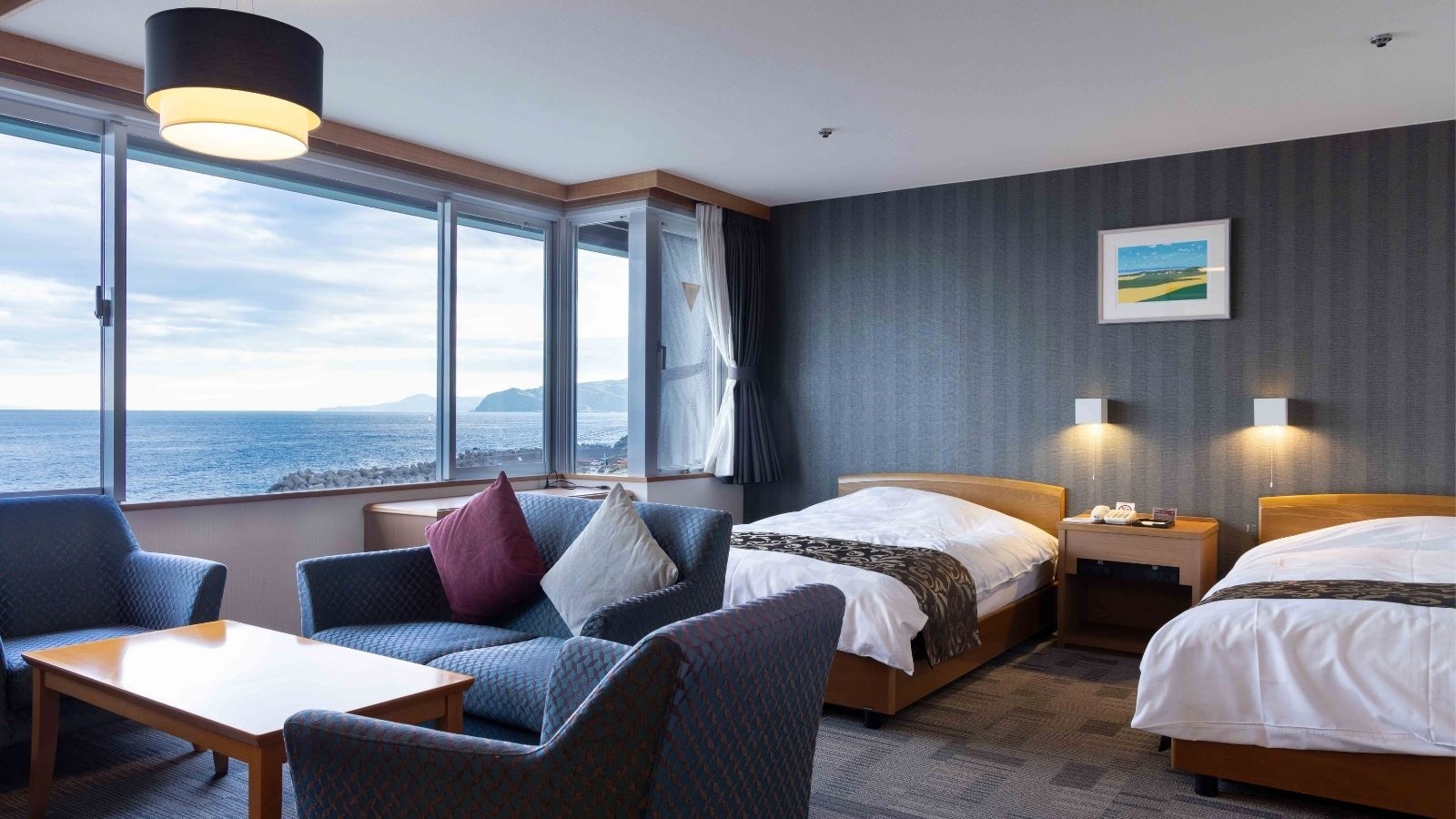 大きなベットで快適にお過ごしいただける、広さ33平米のゆったりとしたツインルーム。 お部屋の窓からは目の前に広がる海を一望できます。