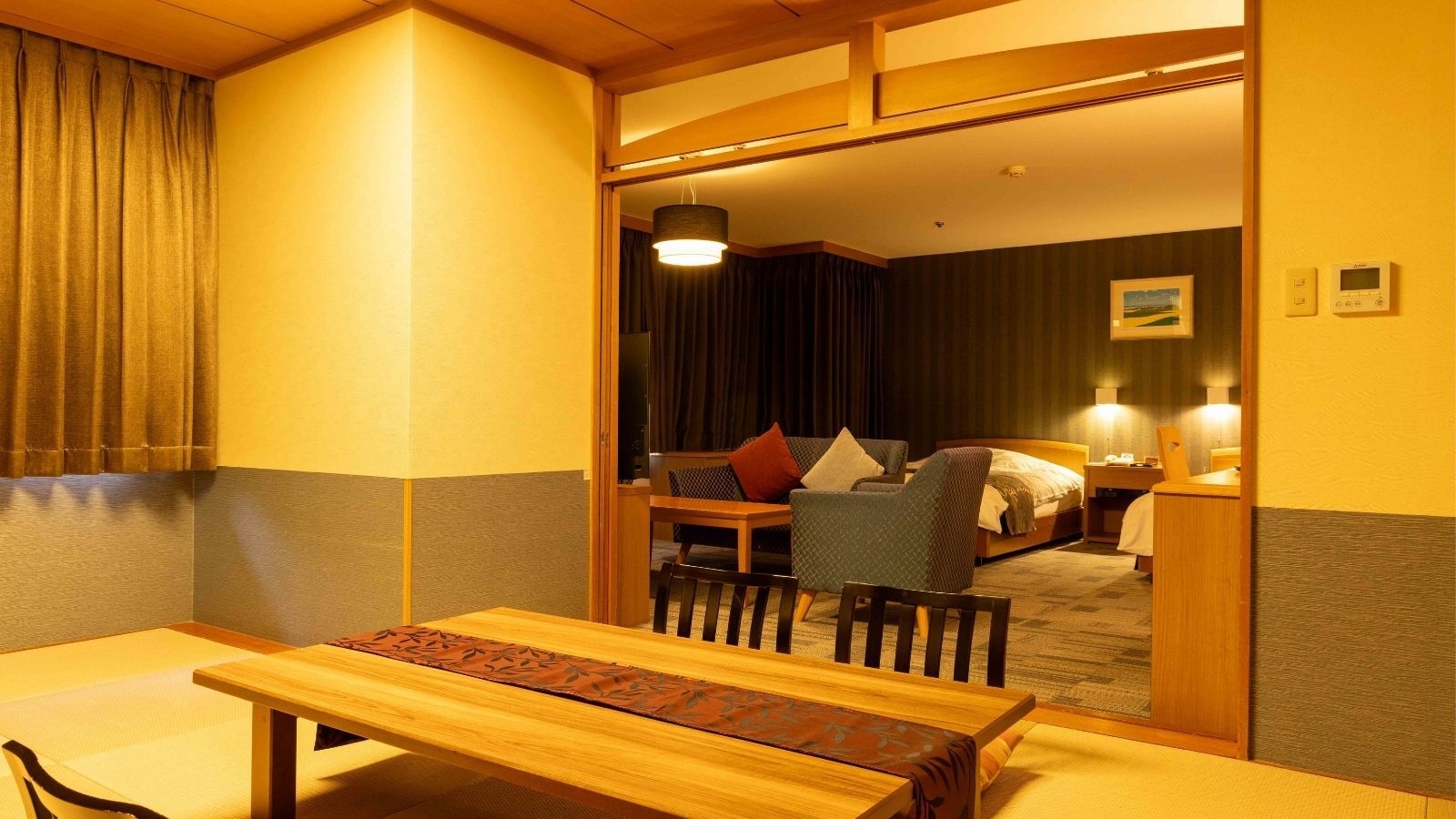 角部屋で二間続きの広々としたお部屋をご用意いたしました。小さなお子様連れのご家族旅行や大人数でのご旅行に最適です。