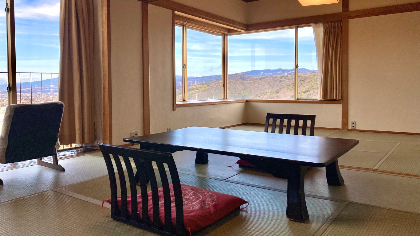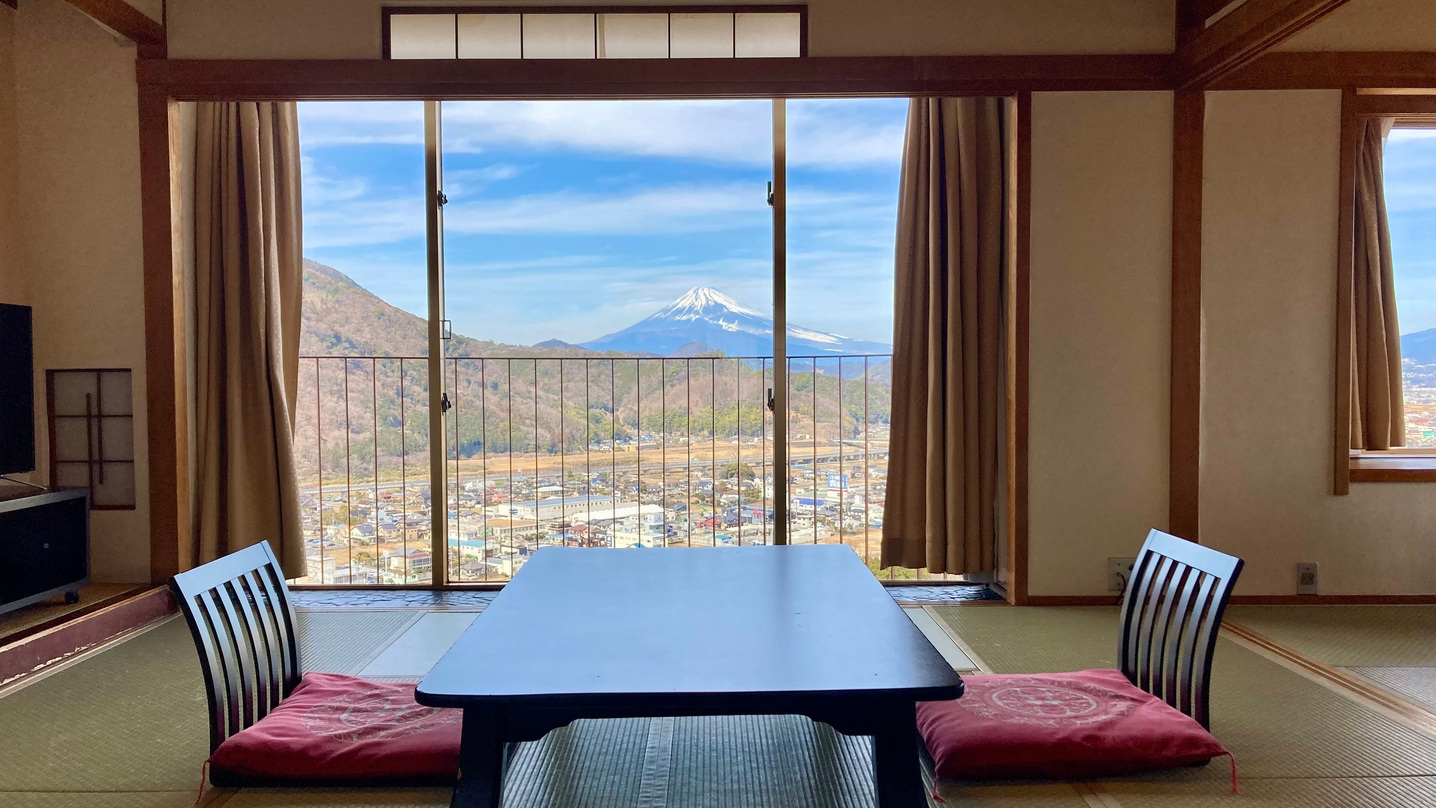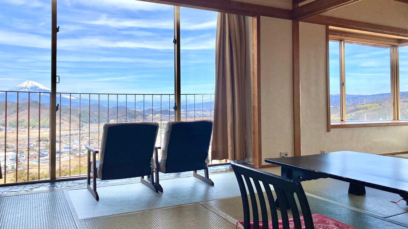 当館の富士山側客室は、天候が良い日には昼は雄大な富士山、夜は大仁の夜景をご覧いただける、