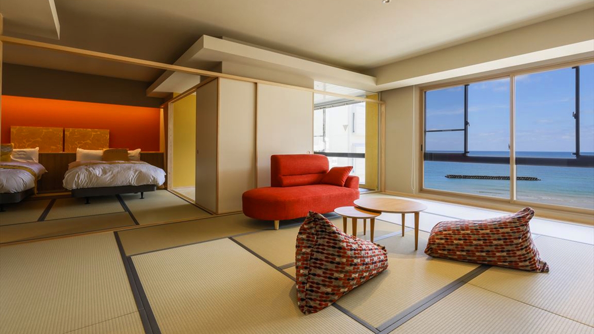こちらの部屋タイプでの夕食は別個室でのご用意となります。和室とベッドルームを襖で間仕切りができます。