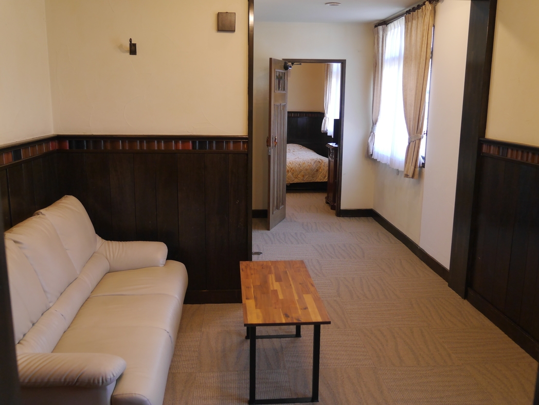 吹き抜けのリビング・ベットルーム2室約40平米・洗面・トイレ・クローゼット・冷蔵庫・テレビ2台・ソファー・テーブル・エアコン2台