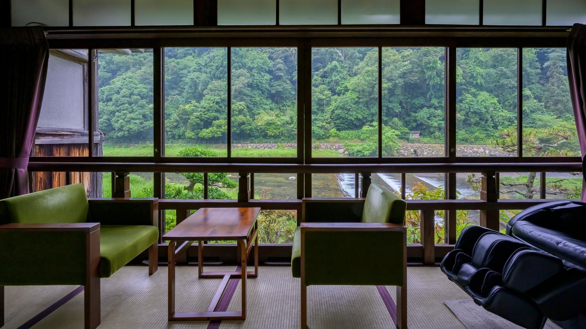 三徳川や山々の緑を当館最上階から眺める、眺望が自慢の客室。和室だけでなく、内風呂からも美しい自然をご覧いただけます。
