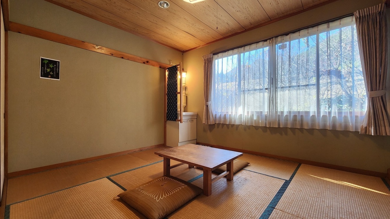 和室7.5畳の洗面台付のお部屋です。 1名様〜3名様でご利用可能です。 大きな窓からは新緑や紅葉、雪景色の山並みをお楽しみ頂けます。