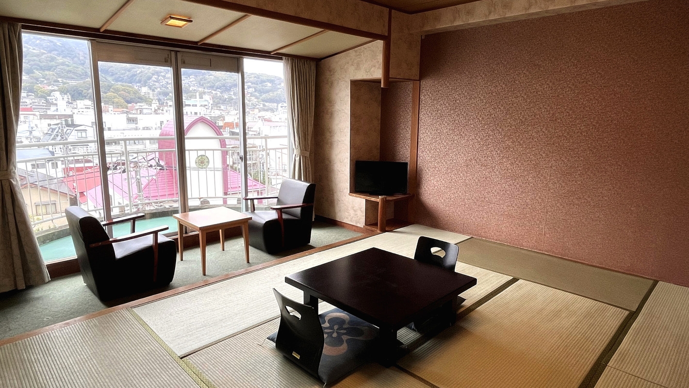 和室10畳のお部屋となります。お部屋にはお風呂のご用意がございませんので、ご入浴は館内の大浴場、露天風呂をご利用くださいませ。