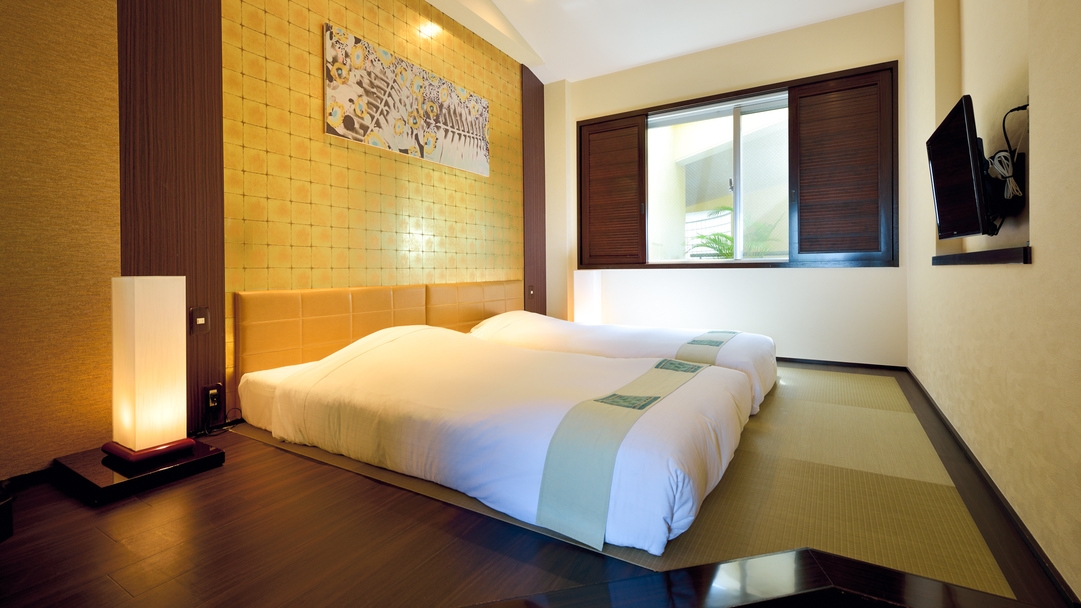 ベッド2台と、和室にマットレスを設置した、最大定員4名の和洋モダンタイプのお部屋