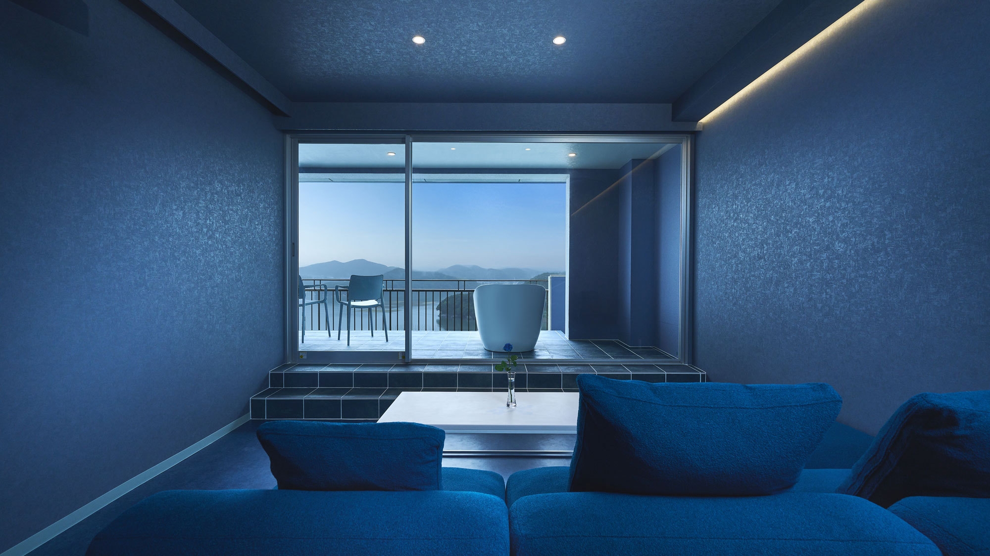 扉を開けると広がる恵みに伊勢湾。 穏やかな海と同化するように広がる青。 海と空の境目がゆるやかに溶けあう、 露天風呂付きプライベートルーム