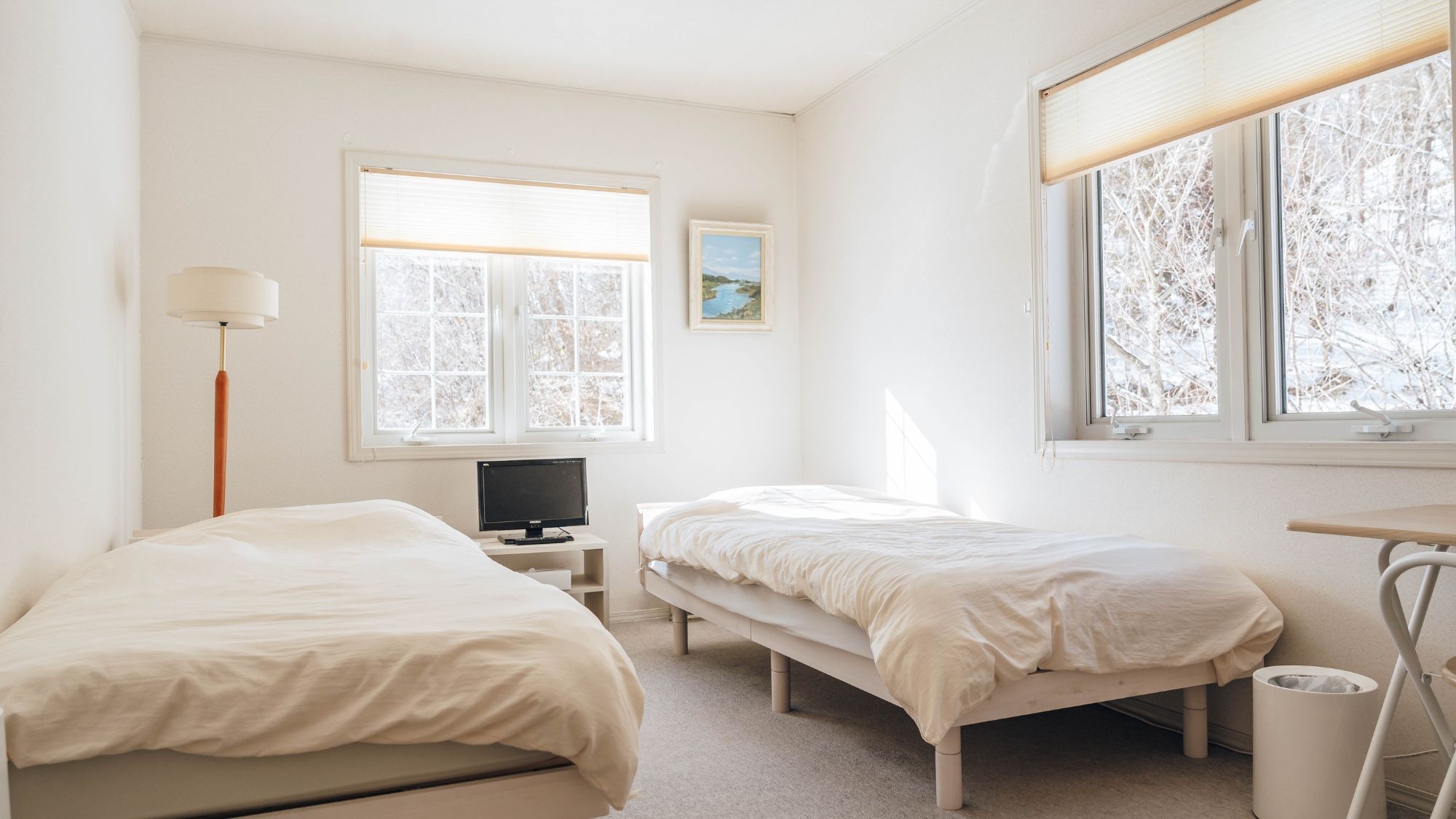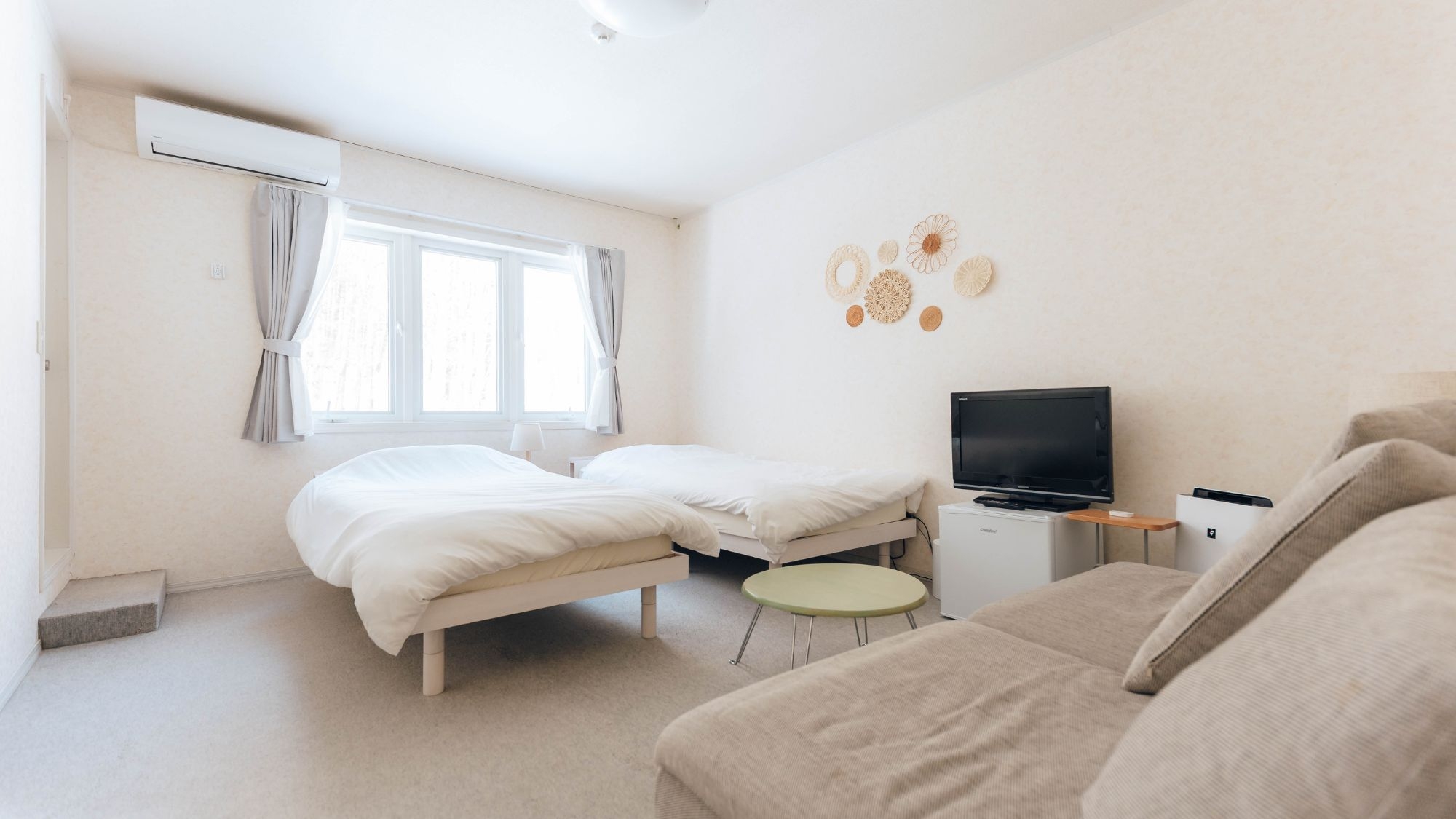 一人旅のお客様も大歓迎♪高原野菜畑に囲まれ、太陽の光が降り注ぐ静かで明るいツインルーム。広めのお部屋です。真夏でも涼しい高地にあるため、冷房はありません。