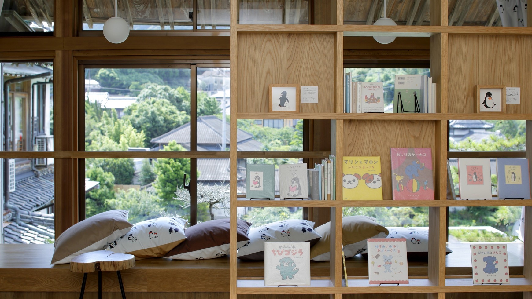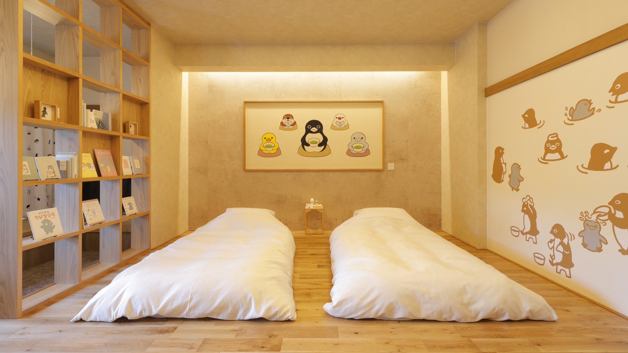 新しく生まれたリノベーションルーム。1-3名宿泊可能。さかざきちはるさんがこれまで手がけてきた本(絶版含む)と、原画作品を展示。客室への移動には階段の利用が必要