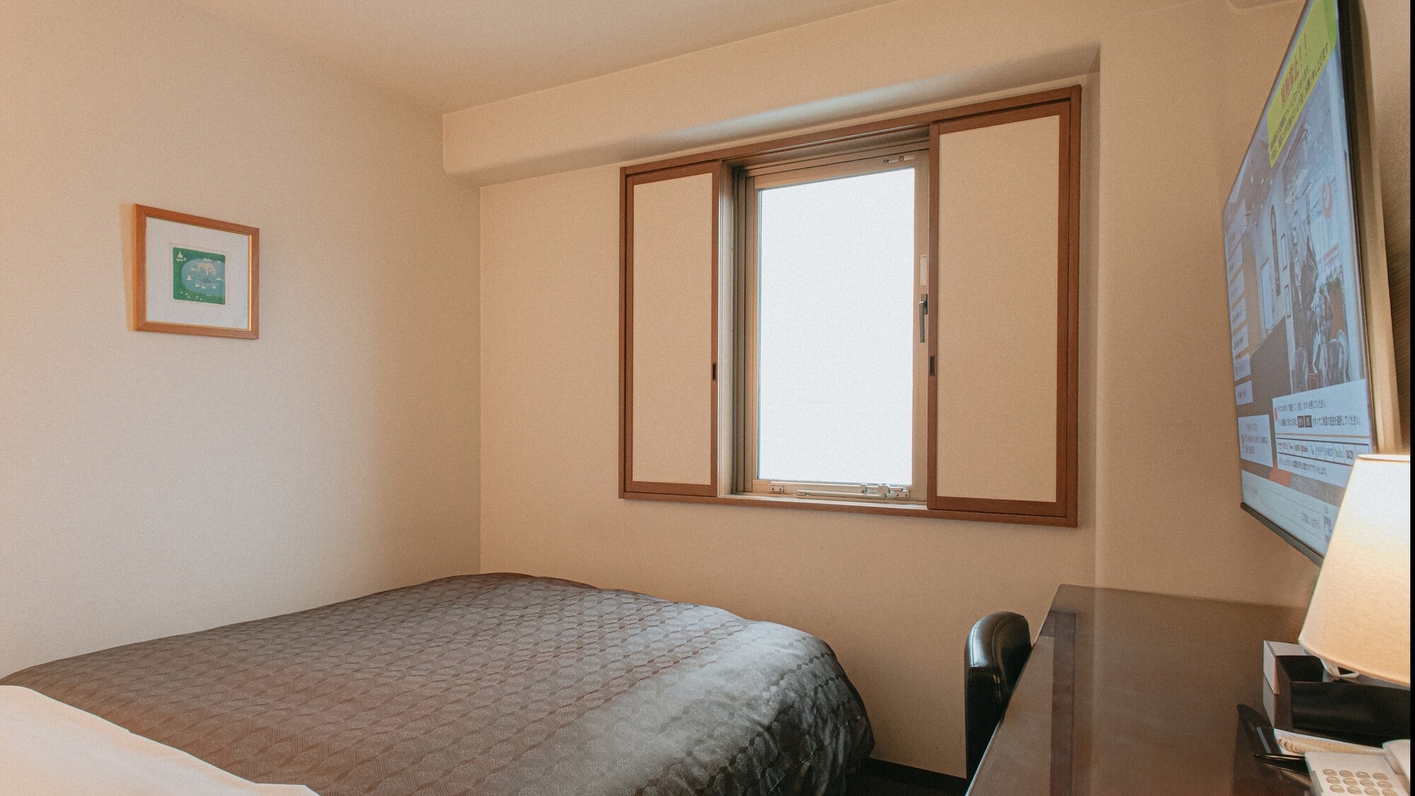 ダブルベッド《140cm幅》で2名様でも窮屈感なくゆっくりお休みいただけます。