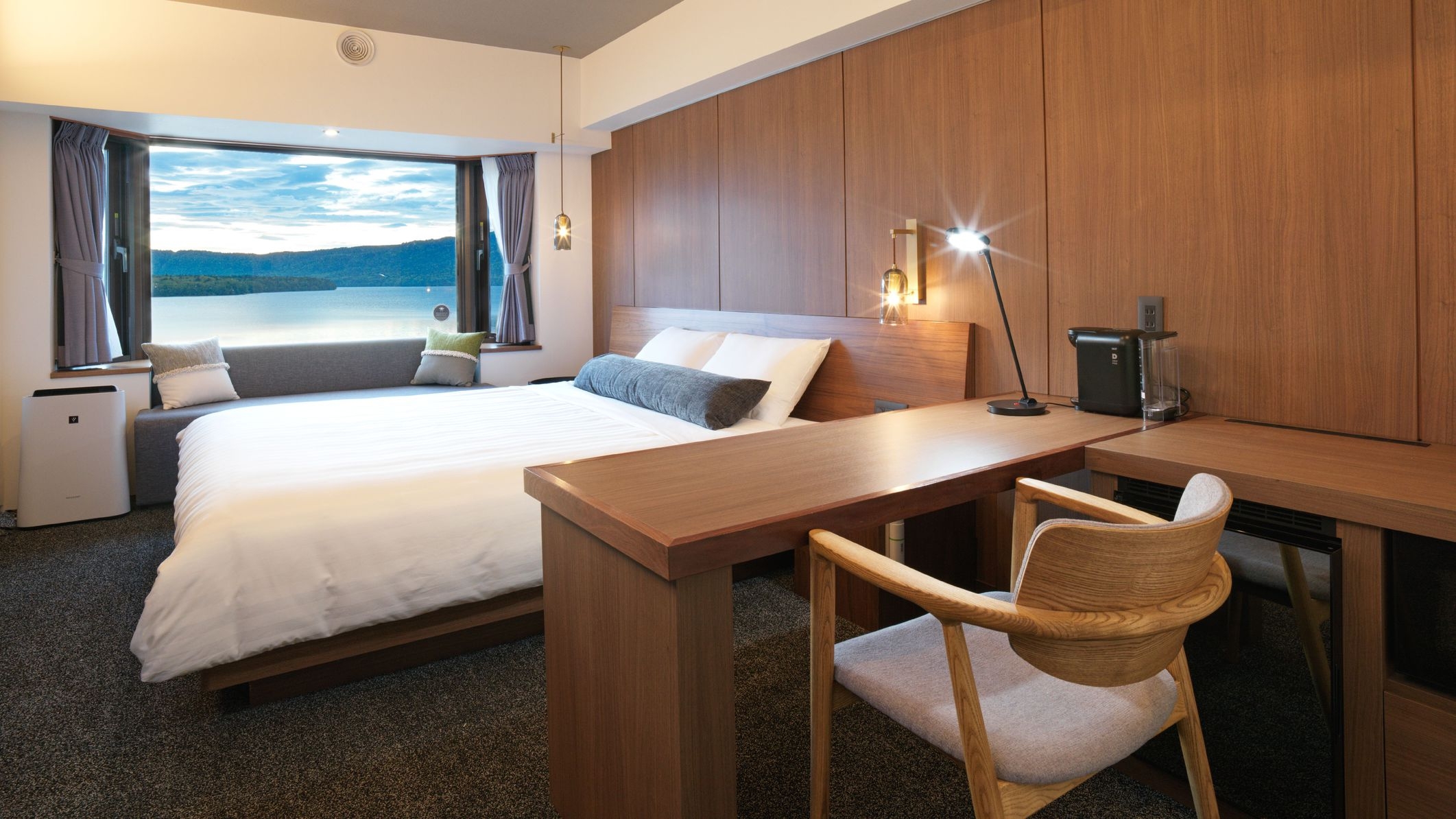 <全室禁煙>洗練されたイメージの中にも優しい雰囲気があるお部屋。窓からは阿寒湖を一望できます※シャワーブースのみ
