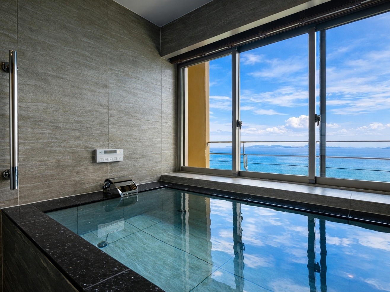 2025年7月リニューアル! 瀬戸の山々を切り取るプライベート・テラスバス※客室の半露天風呂では温泉をお楽しみいただけます。