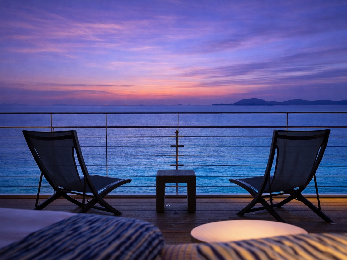 瀬戸内海が一望でいるデッキ付きのお部屋でごゆっくりおくつろぎください。※3名様でご利用に場合はスタッキングベッドを追加させていただきます。