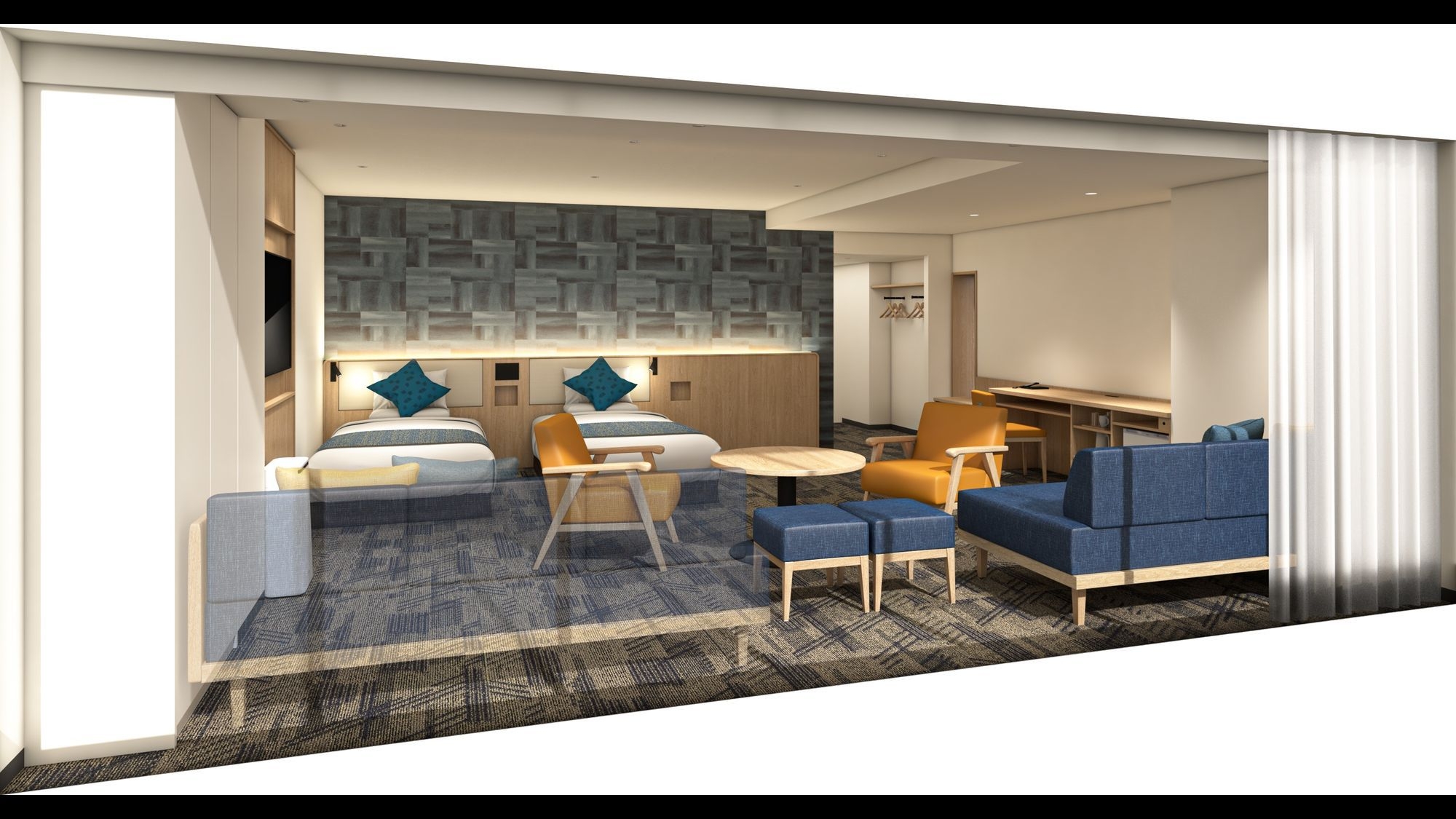 2026年リニューアル! 広さ:22.3〜25.2平米 ベッド幅:120cm×2台 エキストラベッド98cm×1台 4Kスマートテレビ/加湿機能付空気清浄機付き
