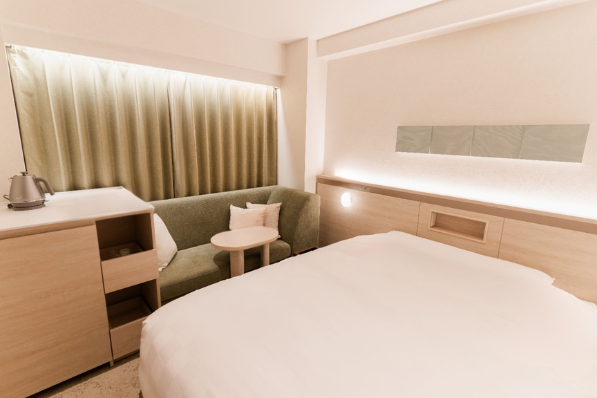 お部屋の広さ:約18平米 ベッドの大きさ:ダブルベッド140cm×200cm(1台) 大人定員:最大1名 添寝定員:最大1名