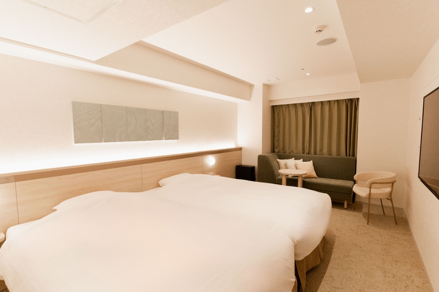 お部屋の広さ:約30平米 ベッド:ワイドシングル110cm×200cm(2台) 大人定員:最大1名 添寝定員:最大2名