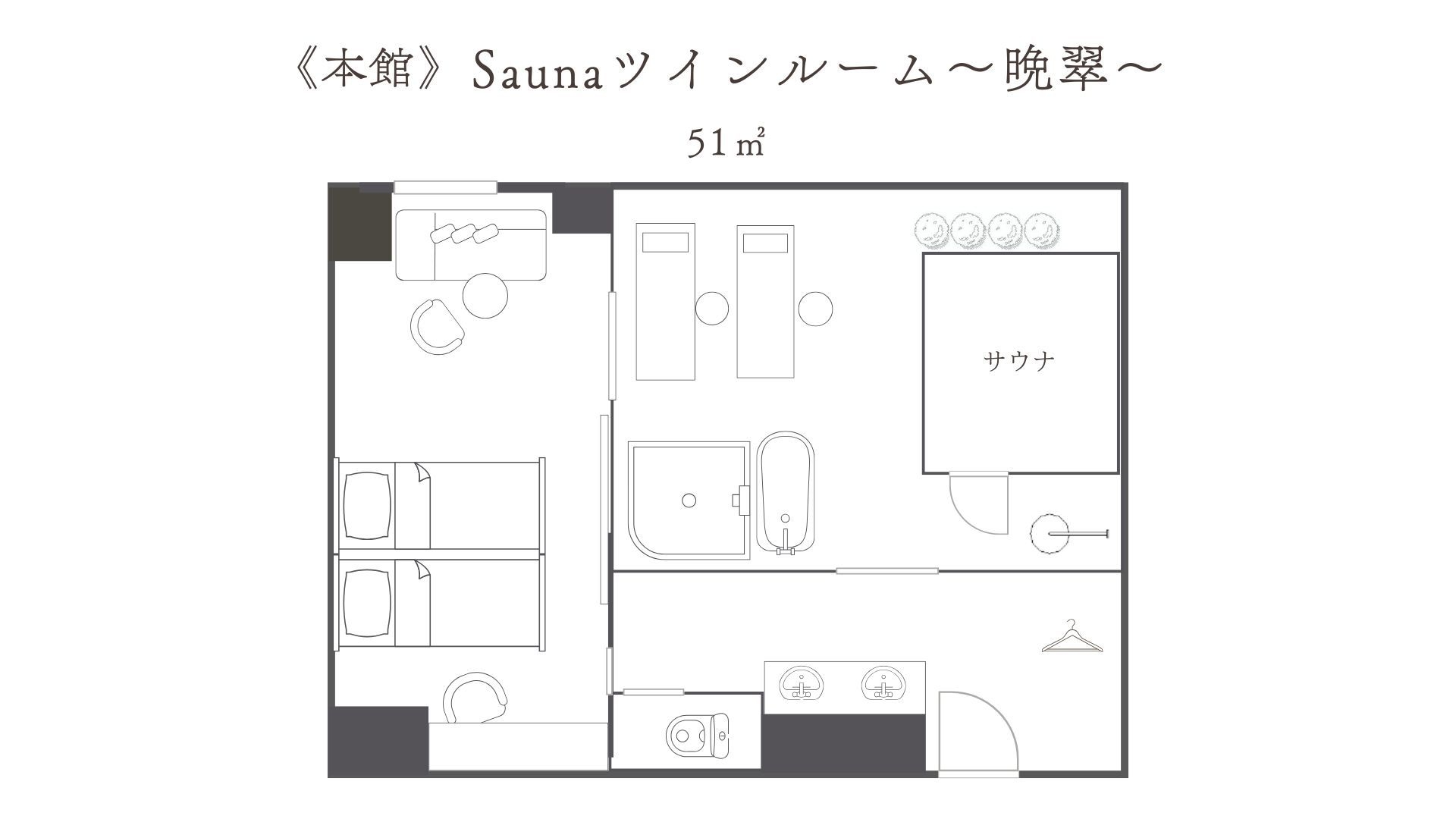サウナ室・大浴槽・水風呂◇51平米◇セミダブルベッド120cm×200cm(2台)◇バストイレ別・独立洗面台完備