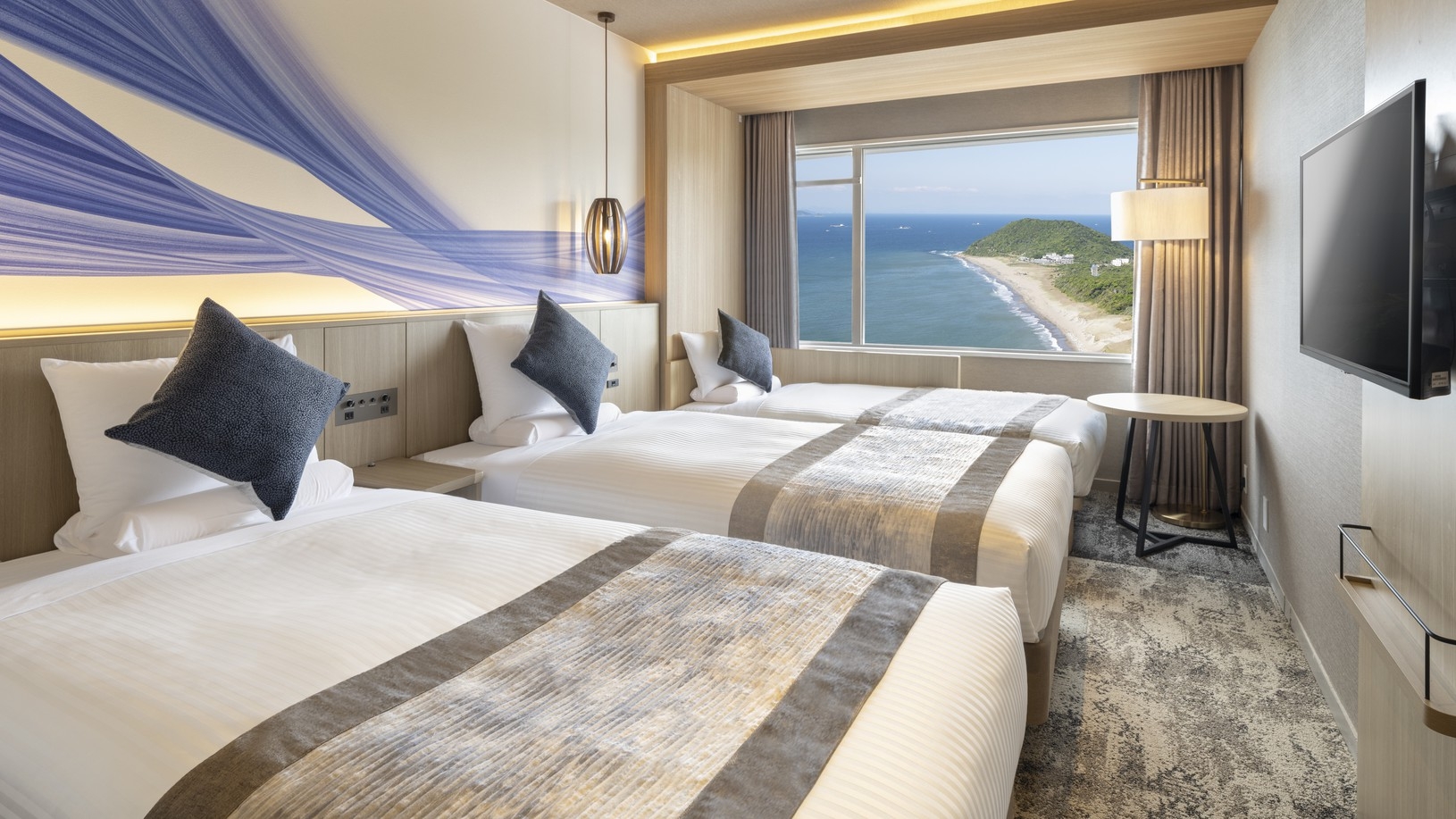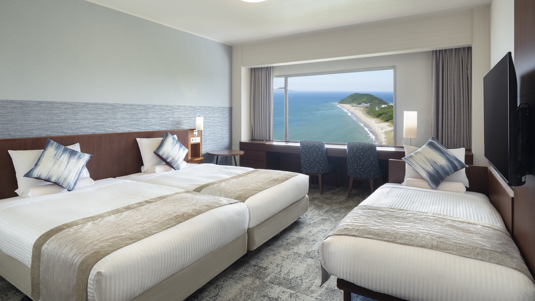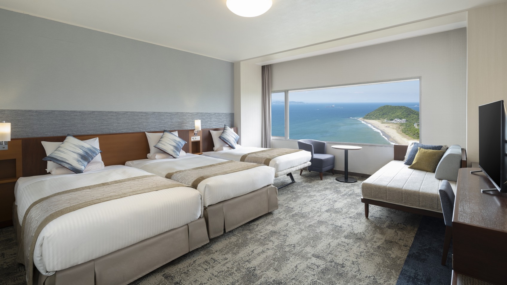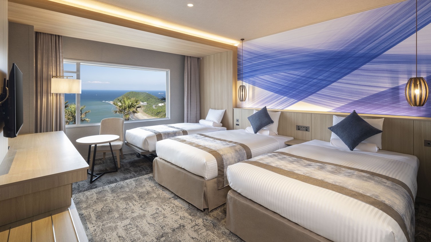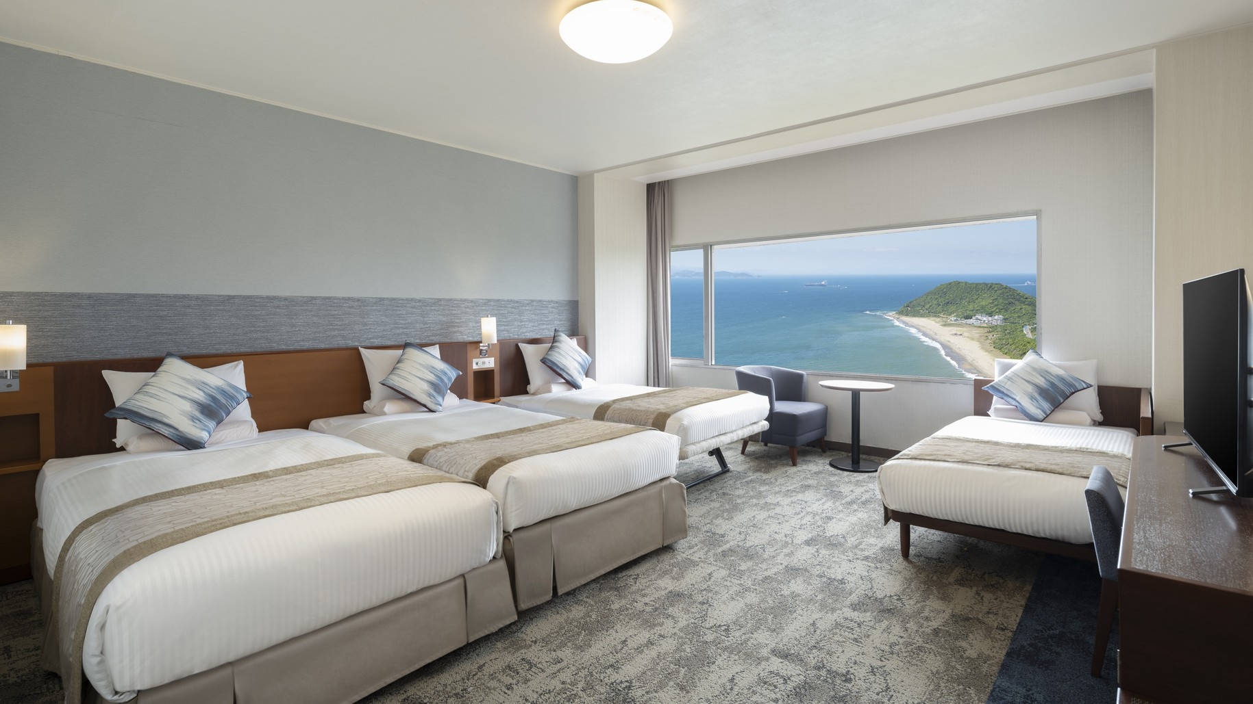 全室オーシャンビュー 広さ:50平米/ベッド幅:122cm×2台、布団×3組