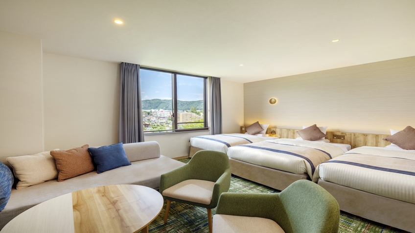 多摩川と山々を望むシャワーブース付客室。ベッドで最大4名様まで(1名様はソファベッド使用)ご利用いただけます。