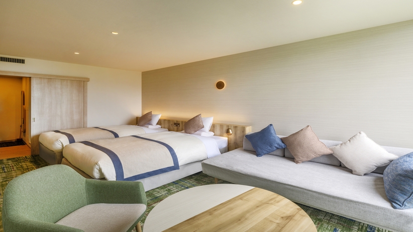 露天風呂と洋室ツインルーム、6畳の和室を備えたお部屋です。幅広い年齢層の方におすすめです。