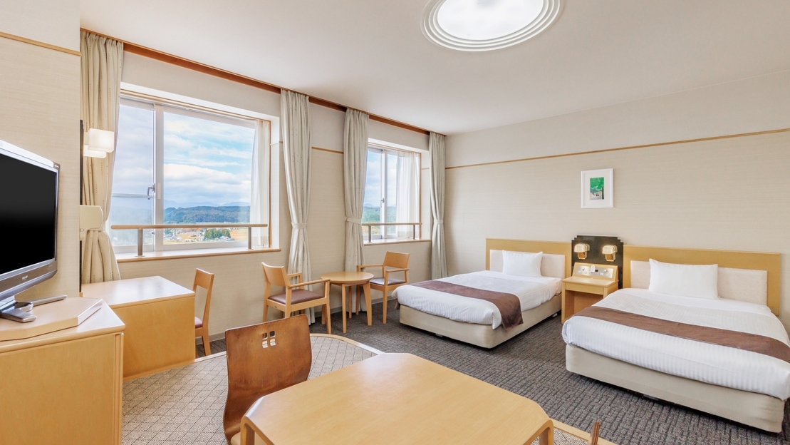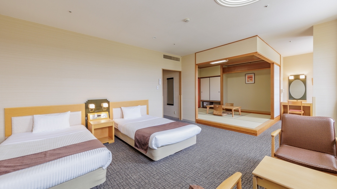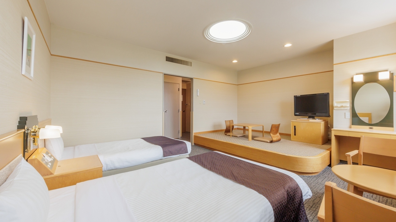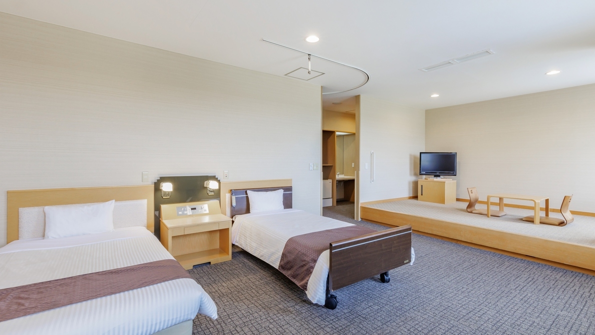 素足で過ごせるモダンタイプの畳のお部屋にベッド2台のお部屋。畳に布団を敷くことができ、最大3名様までお泊りいただけるファミリーにも人気のお部屋です。