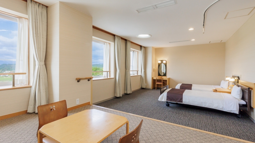 車椅子でご利用いただける洋室(シングル2台)と畳の小上がり(お布団にて2名対応可)がございます。電動ベッド・介護リフトも備え付けております。