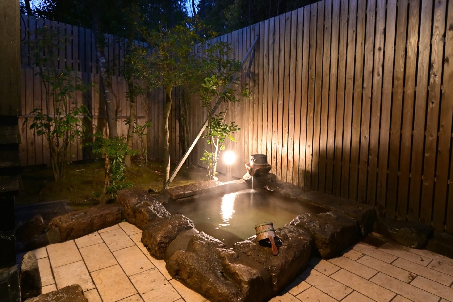 ふたり静の全5棟、すべてのお部屋に『内湯』と『露天風呂』がついておりますがこちら【花の音】のお部屋には、女性に大人気の『岩盤浴』もついております。24時間、お好きな時間帯にご利用いただけます。・御夕食は18:00の一斉スタートとなっておりますので御到着が18:00を過ぎる場合は連絡をお願いします。大幅に遅れる場合は御夕食がご提供できない場合がございますのでご了承ください。・御朝食は8:30か9:30からのご提供となっております。お早目にチェックアウトをご希望される方はご提供ができない場合がございます。予めご了承ください。御宿泊は中学生以上でお願い致しますお食事も、お部屋でとっていただけるので、お越しの方と水入らずで、ごゆっくりおくつろぎ頂けます。誕生日や結婚記念日など、大切な方とのお祝いには、特におすすめです♪♪ぜひ、遊びと癒しに満ちた“大人の隠れ家”で、特別な日をお過ごし下さい。■お食事(料理の一例です。季節に合ったお料理をご提供いたします。)■お部屋のご紹介【花の音(和洋室)】リビングルーム(70平米)・ベッドルーム■4種類のお風呂釜風呂・水風呂・岩露天風呂・岩盤浴あり〜内風呂は、レトロな作りの釜風呂です。お部屋の露天風呂は源泉かけ流しです。【検索キーワード】露天風呂付客室・部屋食・離れ