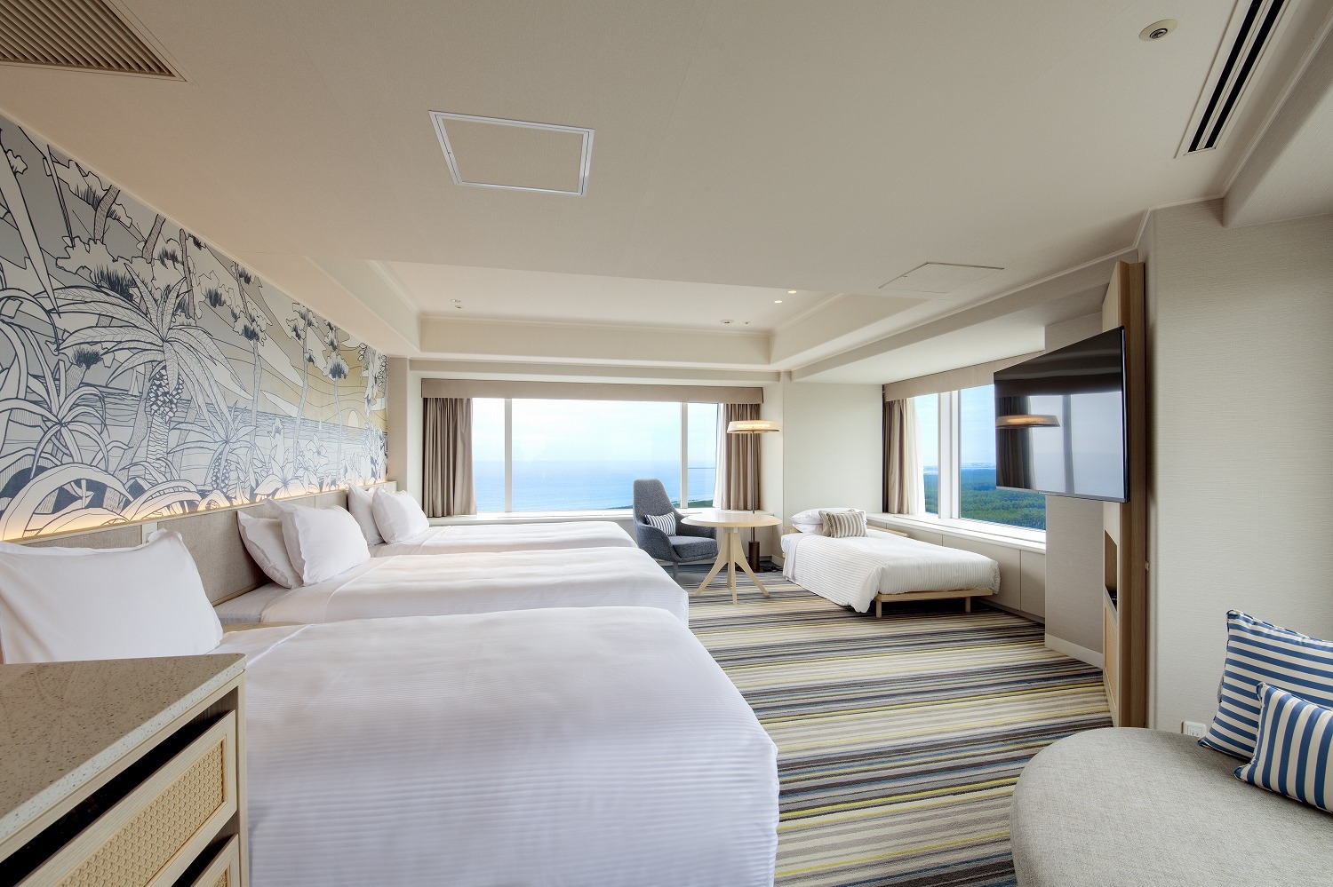 オーシャンビューの広々とした50平米のお部屋です。※ご予約人数が1〜2名の場合は、ベッド2台でご準備させていただく可能性がございます。予めご了承ください。