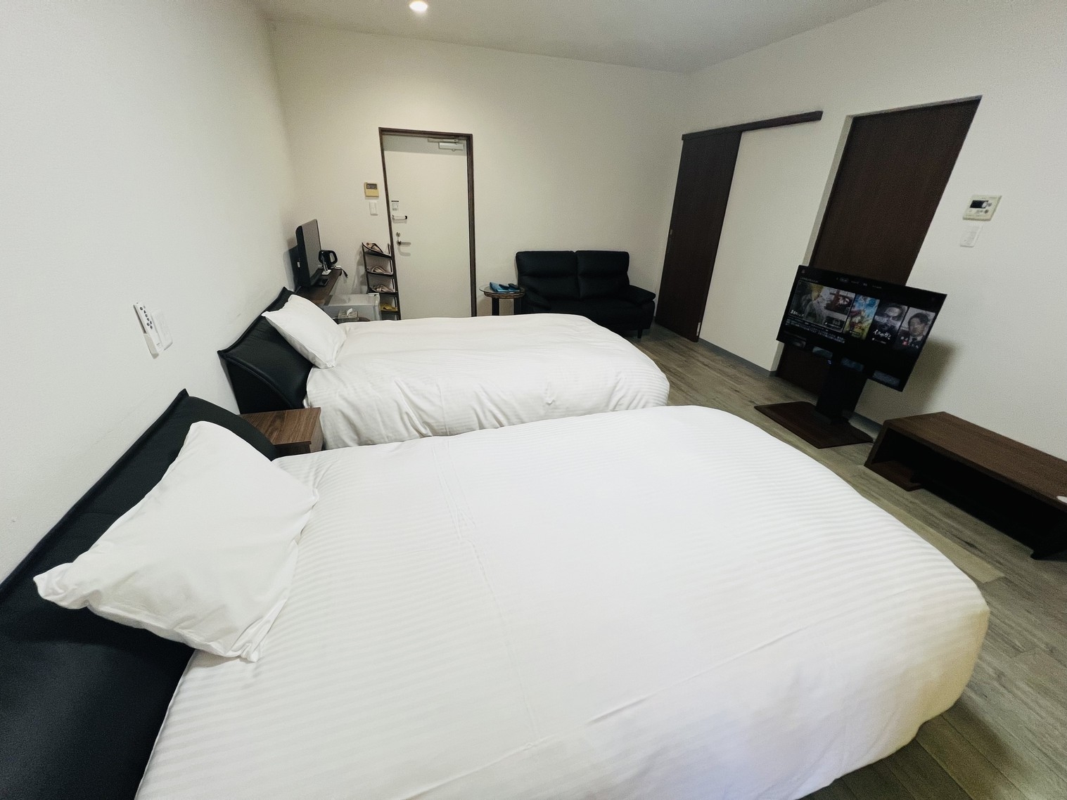 テレビ 冷暖房 冷蔵庫 無料Wifi完備。2泊以上の連泊をいただく場合、ご宿泊中のシーツ交換・清掃サービスは行っておりません。地上波放送×Netflix見放題
